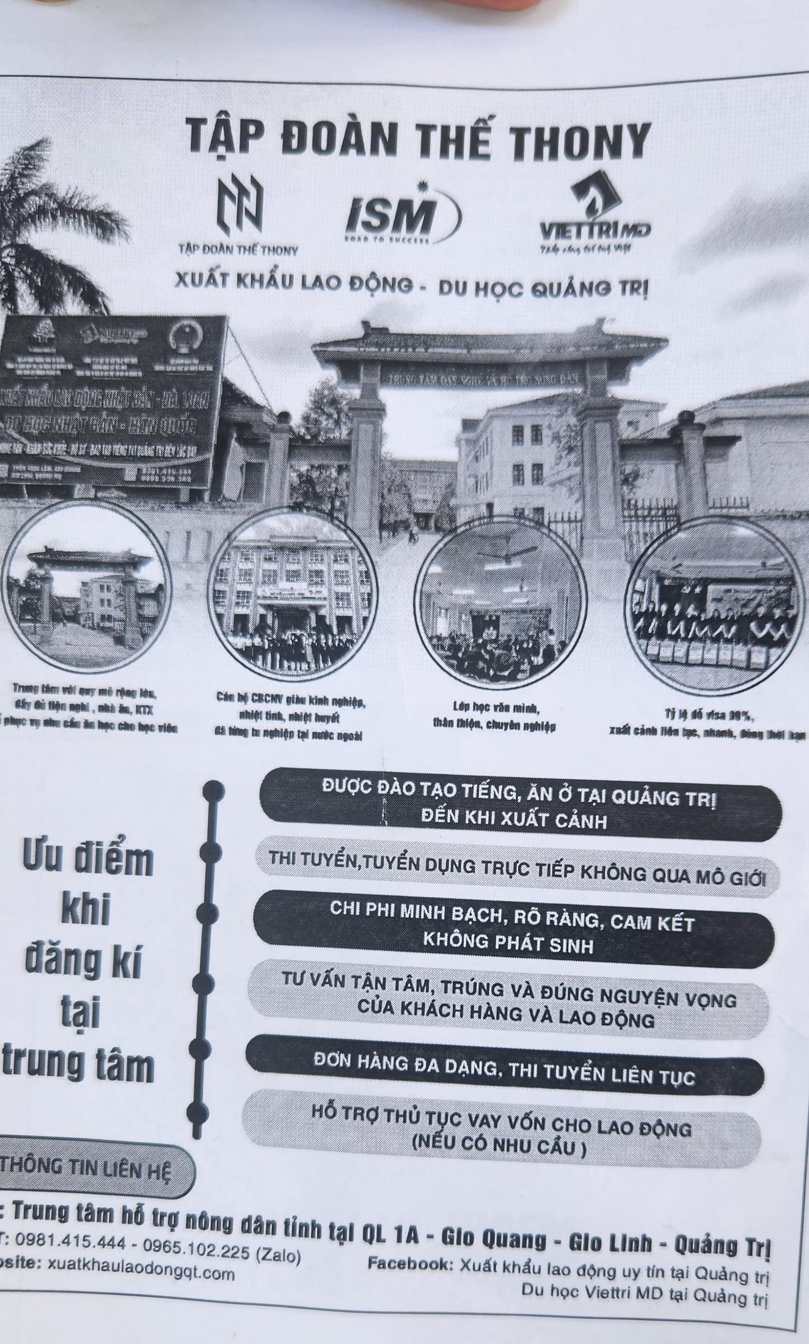 Tạo được sự tin tưởng từ chúng tôi, người phụ nữ tiếp tục đưa chúng tôi tờ rơi giới thiệu về hoạt động của Tập đoàn Thế Thony cùng logo của một số công ty, đơn vị khác quảng cáo về việc: Xuất khẩu lao động - Du học Quảng Trị.