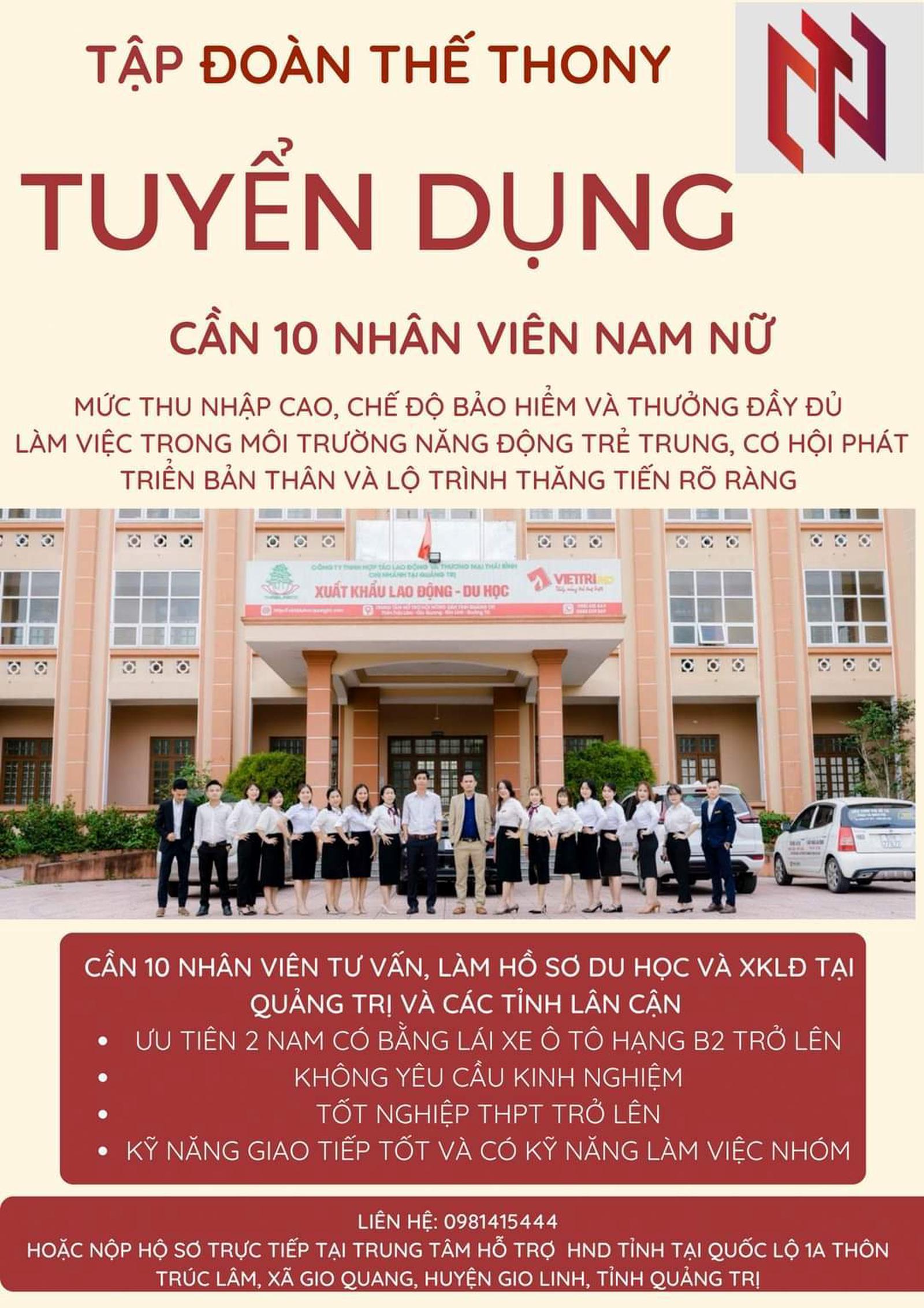 Việc quảng cáo tuyển dụng đều đăng tải với số điện thoại 0981.415.444 và đây cũng là số điện thoại của ông Nguyễn Thế, người đại diện pháp luật của Công ty TNHH MTV Thế Thony (địa chỉ phường An Đôn, thị xã Quảng Trị, tỉnh Quảng Trị).