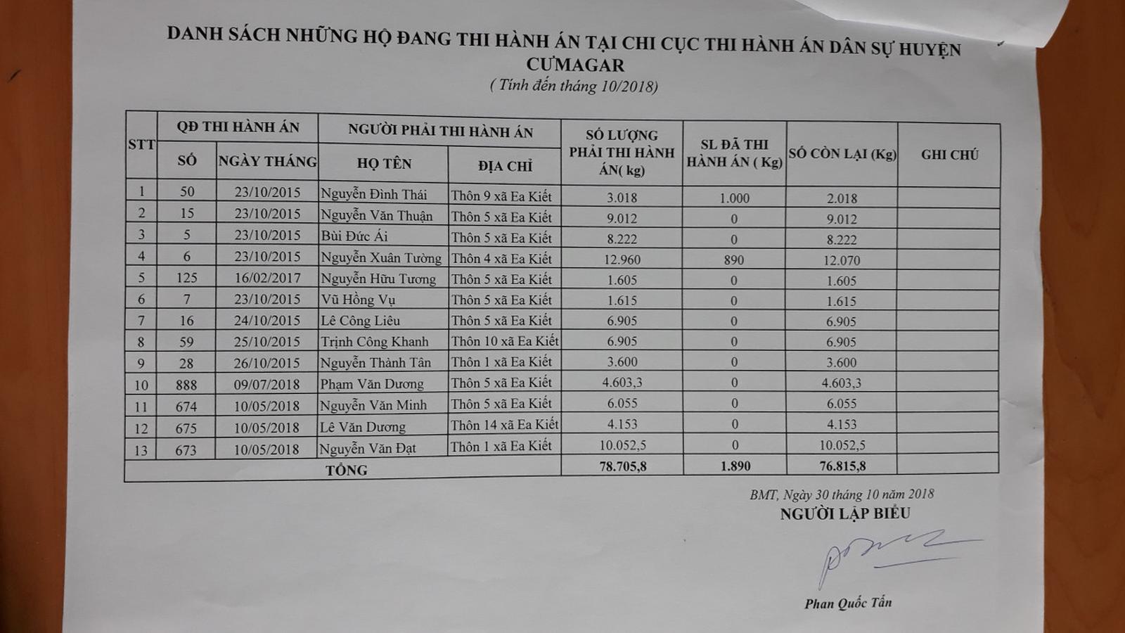 Danh sách các vụ án chưa được thực thi tại địa bàn xã Ea Kiết. Ảnh: Nhóm PV