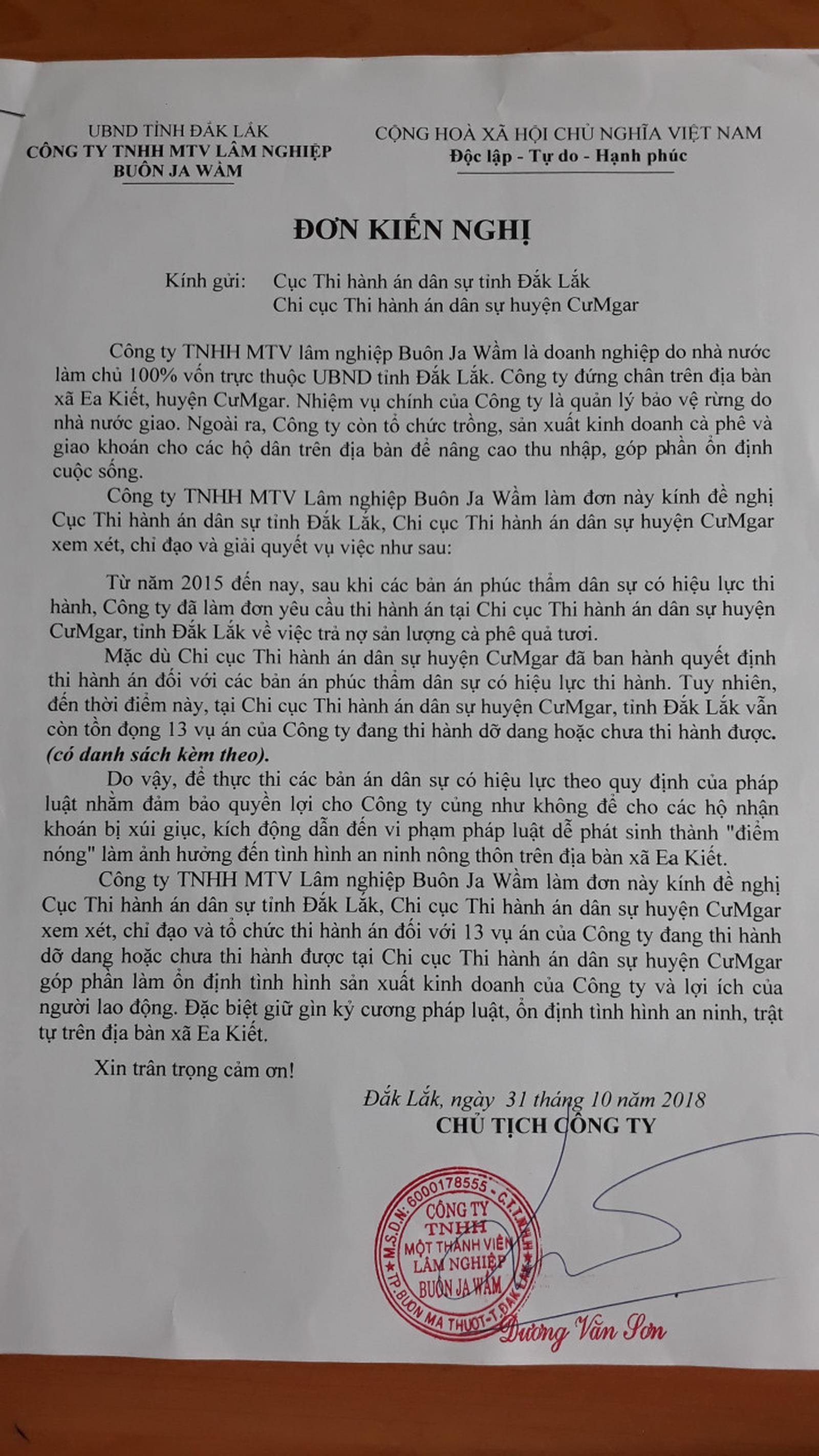 Theo Đơn kiến nghị gửi đến Tòa soạn Báo Thanh tra của Công ty TNHH MTV lâm nghiệp Buôn Ja Wầm, từ năm 2015 đến nay, Chi cục Thi hành án dân sự huyện Cư M’gar đã ban hành quyết định thi hành án đối với các bản án phúc thẩm dân sự có hiệu lực thi hành tại địa bàn thuộc sự quản lý của công ty tổng cộng là 13 vụ. Đáng nói là, “cho đến thời điểm hiện nay (tháng 1/2019), Chi cục Thi hành án huyện Cư M’gar chưa thi hành được cũng là 13 vụ”!