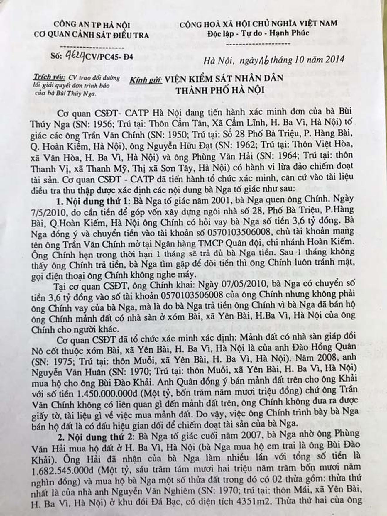 Theo đó, bà đã có rất nhiều đơn tố cáo gửi đến Cơ quan Cảnh sát điều tra (CSĐT), Công an TP Hà Nội. Vụ việc đã được Phòng Cảnh sát hình sự Công an TP Hà Nội thụ lý điều tra và đã có kết quả xác minh gửi Viện Kiểm sát nhân dân (KSND) TP Hà Nội (tại Văn bản số 4624CV/PC45-Đ4 ngày 16/10/2014).