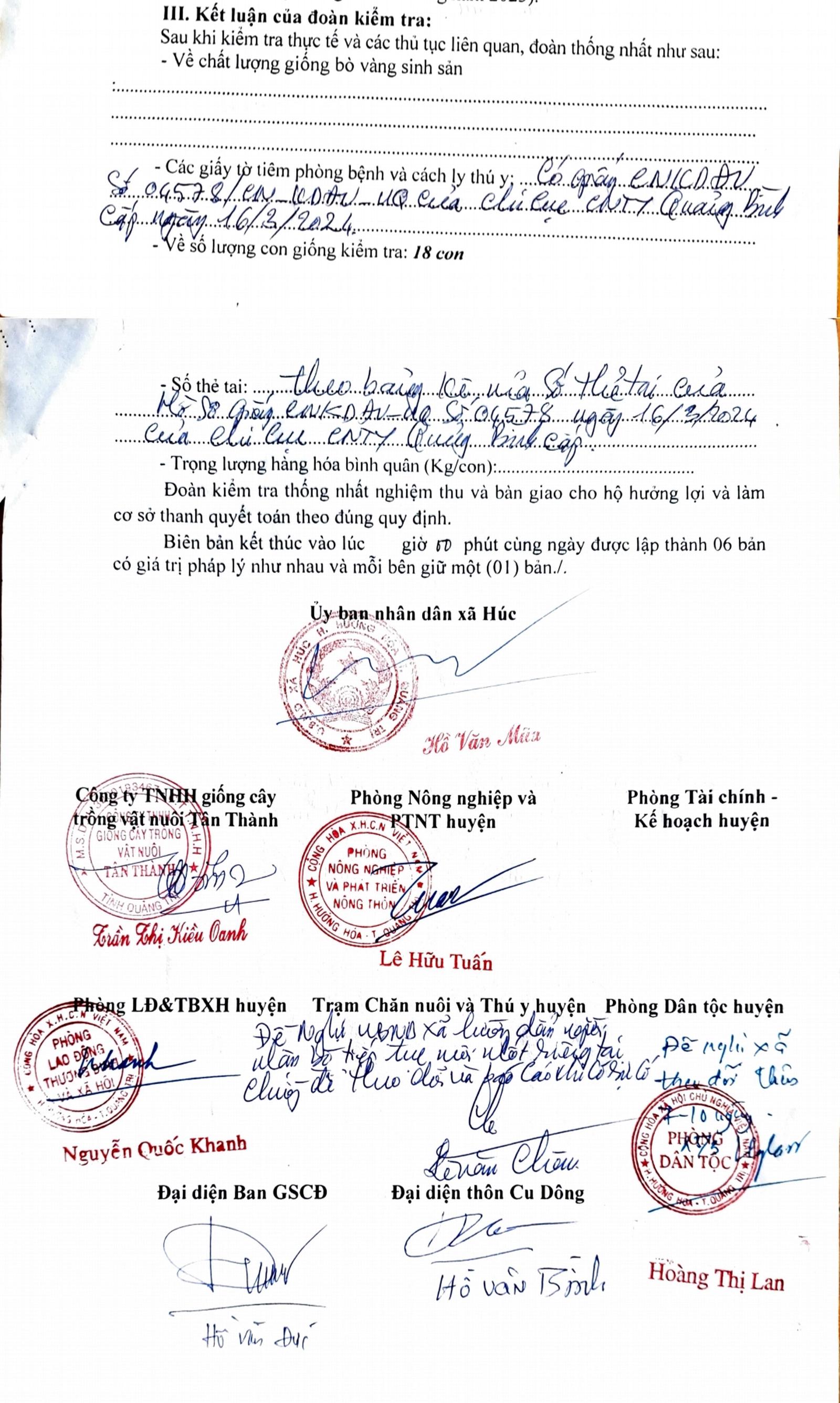 Điều lạ hơn, tại biên bản nghiệm thu 18 con bò giống tại xã Húc không hề có đại diện các hộ tham gia thực hiện dự án. Một số hạng mục khác tại biên bản nghiệm thu, như: Về chất lượng giống bò vàng sinh sản; trọng lượng hàng hóa bình quân (kg/con) lại bị bỏ trống, không hề có ý kiến, đánh giá của của các phòng, đơn vị liên quan.