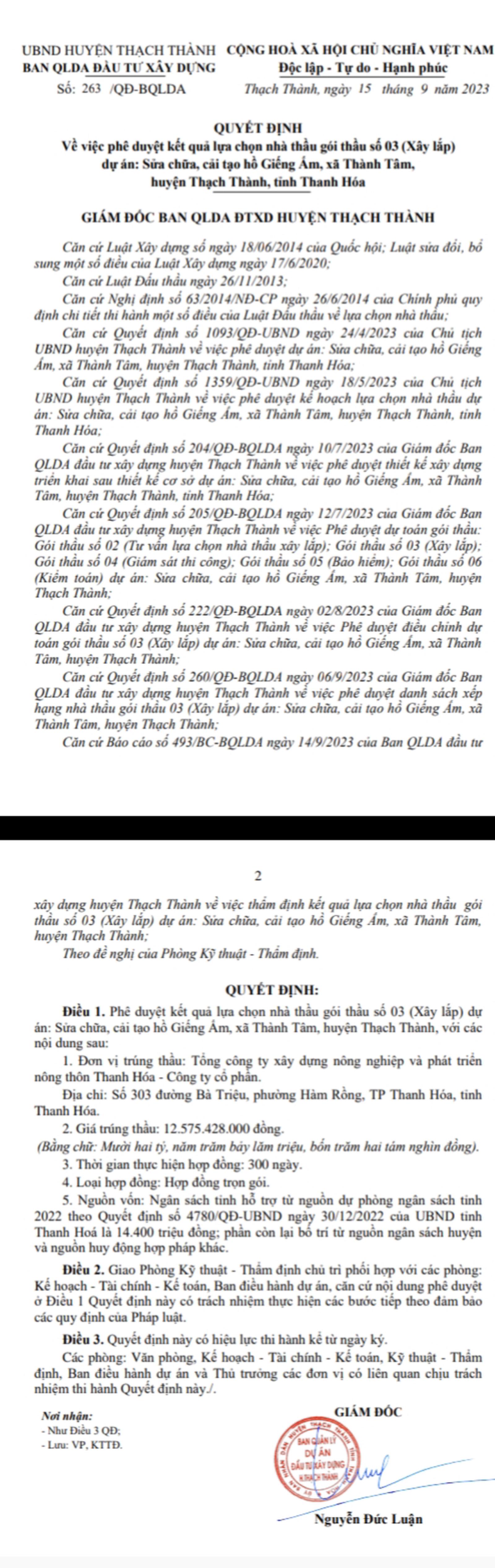 Trước những dư luận chưa được làm rõ, ngày 15/9/2023, Giám đốc Ban Quản lý dự án Đầu tư Xây dựng huyện Thạch Thành Nguyễn Đức Luận đã ký Quyết định 263/QĐ-BQLDA phê duyệt kết quả lựa chọn nhà thầu gói thầu số 03 dự án xây lắp, sửa chữa, cải tạo hồ Giếng Ấm, xã Thành Tâm cho Tổng Công ty Xây dựng Nông nghiệp và Phát triển Nông thôn Thanh Hóa - công ty cổ phần, gây nhiều hoài nghi.
