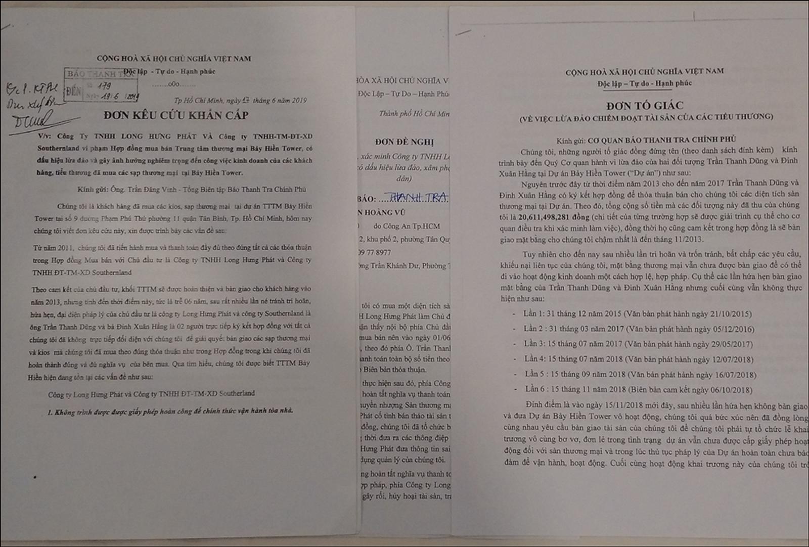 Nội dung đơn của 10 công dân tố giác ông Trần Thanh Dũng (Giám đốc Công ty TNHH Long Hưng Phát) và bà Đinh Xuân Hằng (Tổng Giám đốc Công ty TNHH Đầu tư xây dựng thương mại Southern Land) có dấu hiệu lừa đảo, chiếm đoạt tài sản liên quan đến việc mua, bán diện tích sàn thương mại tại Dự án Bảy Hiền Tower, đề nghị các cơ quan chức năng xử lý và bảo vệ quyền lợi cho công dân bị chiếm đoạt