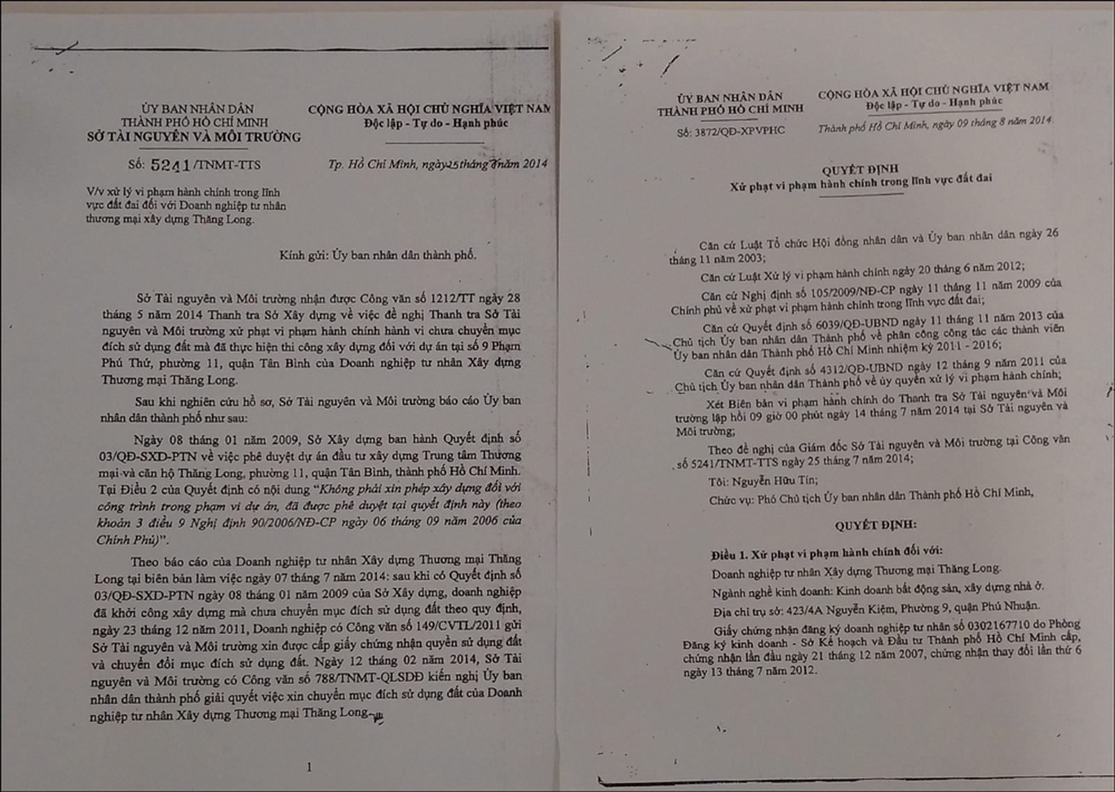 Quyết định xử phạt của UBND TP Hồ Chí Minh đối với chủ đầu tư Bảy Hiền Tower. Ảnh: Nhật Tường