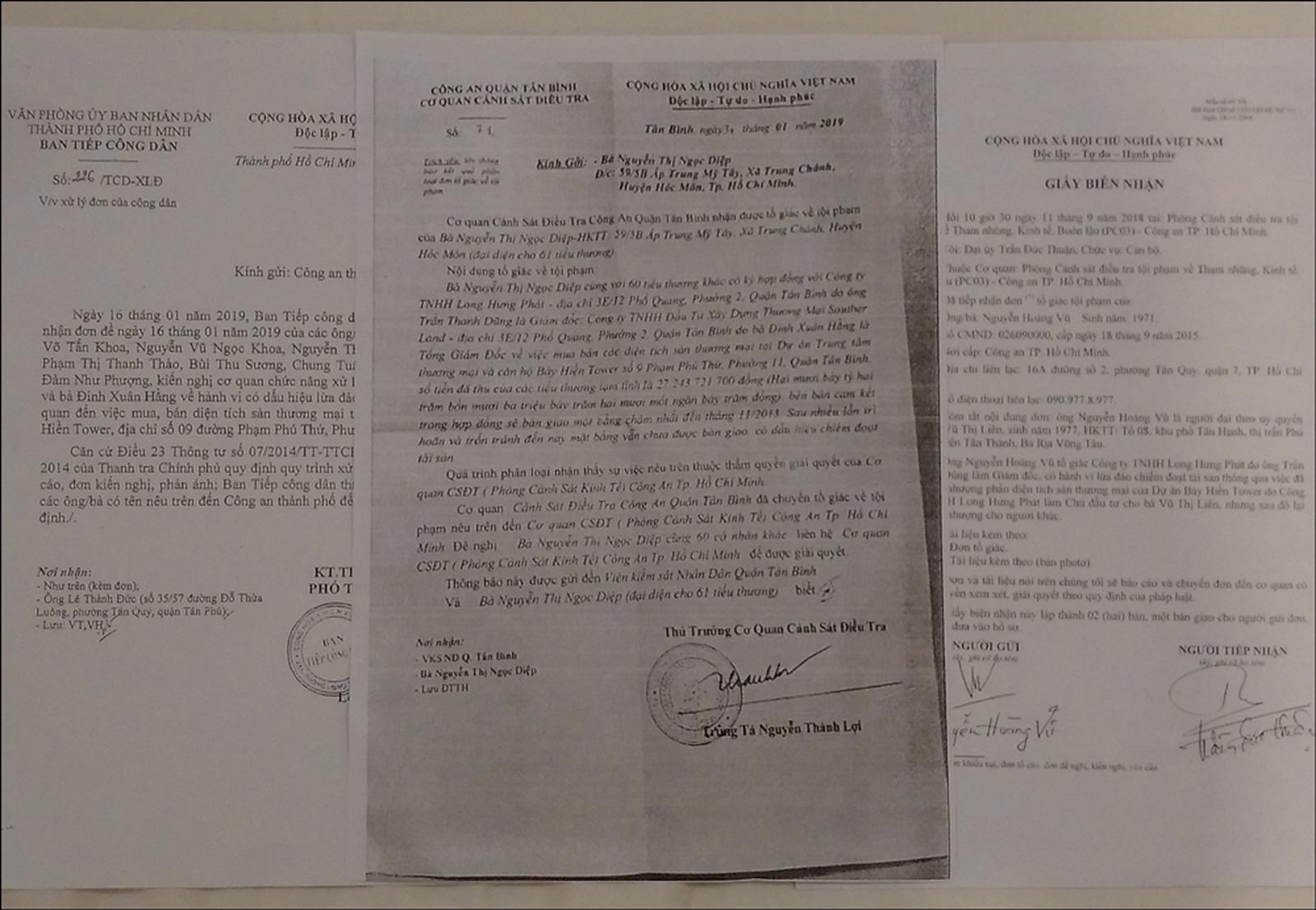 Tiếp đó, ngày 30/1/2019, Cơ quan Cảnh sát điều tra (CSĐT) Công an quận Tân Bình ra thông báo gửi bà NTND về việc hướng dẫn chuyển đơn tố giác tội phạm của bà cùng 60 cá nhân khác lên Cơ quan CSĐT (Phòng Cảnh sát kinh tế) Công an TP Hồ Chí Minh.