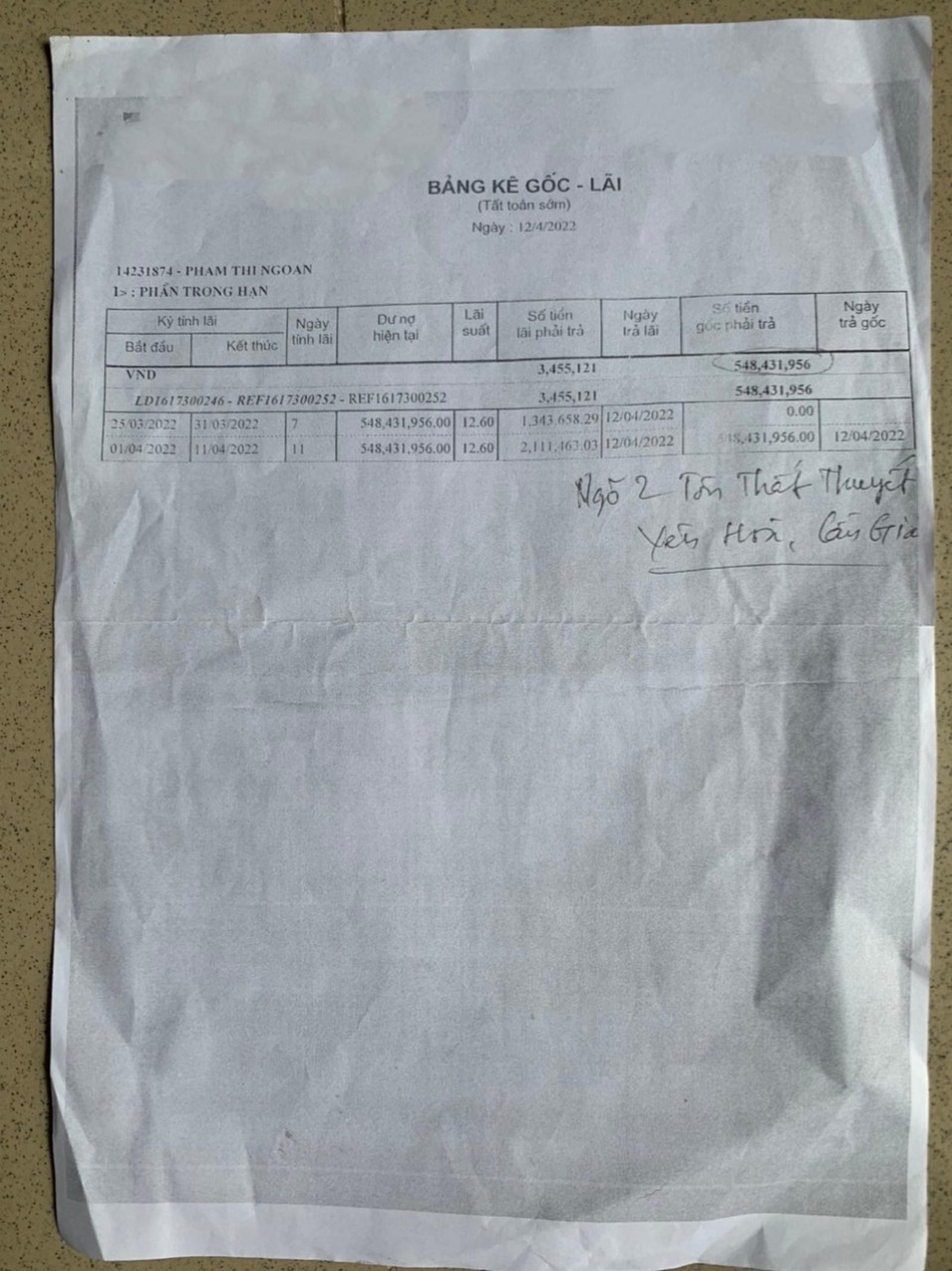 Bảng kê gốc/lãi trong hạn của Phạm Thị Ngoan tại ngân hàng tính đến ngày 01/04/2022 chỉ còn 548.431.956 đồng. Ảnh: Ngọc Hoan