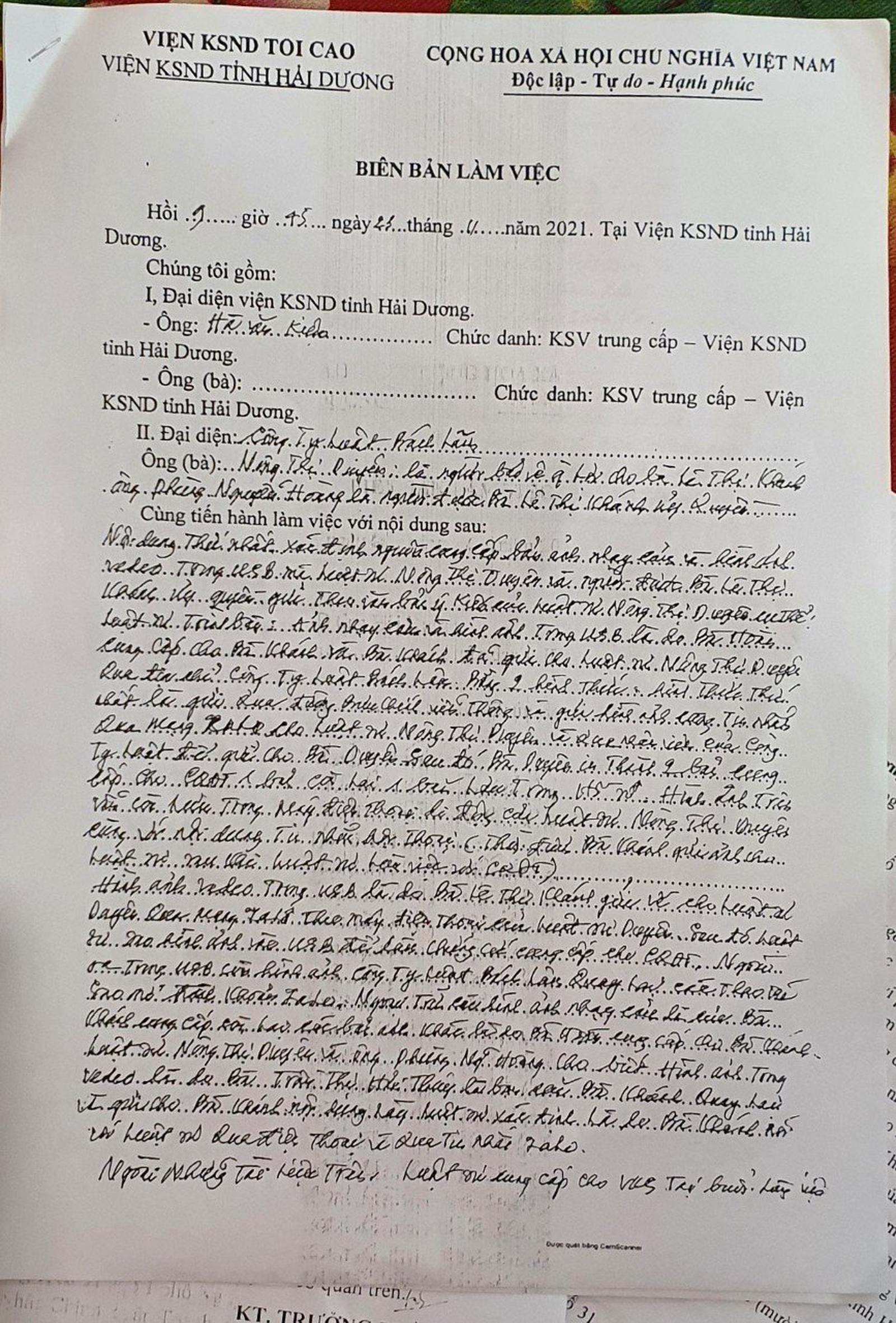 Biên bản làm việc giữa Viện Kiểm sát tỉnh Hải Dương và đại diện Công ty Luật Bách Lâm. Ảnh: NH