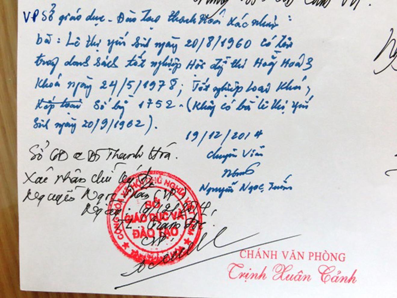 Tuy nhiên, ngày 19/12/2014, chính ông Nguyễn Ngọc Tuấn, chuyên viên Văn phòng và ông Trịnh Xuân Cảnh, Chánh Văn phòng Sở Giáo dục - Đào tạo Thanh Hóa đã xác nhận: Bà Lê Thị Yến sinh ngày 20/8/1960, có tên trong danh sách tốt nghiệp Hội đồng Thi Hoằng Hóa 3 khóa ngày 24/5/1978; tốt nghiệp loại khá, số bằng 1752. Như vậy, không có bà Lê Thị Yến sinh ngày 20/9/1962.