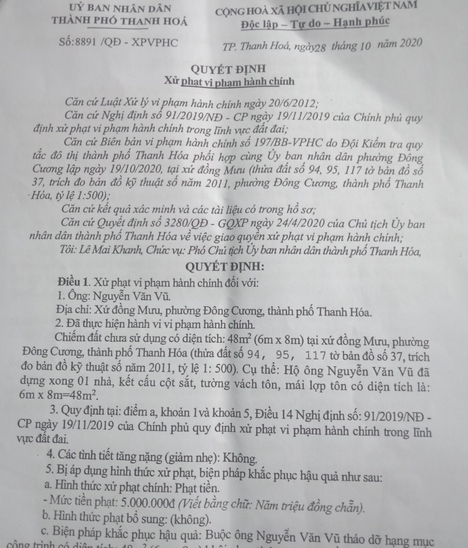 Việc làm này đã vi phạm Điểm a, Khoản 1, Khoản 5, Điều 14, Nghị định 91/2019/NĐ-CP của Chính phủ. Nội dung biên bản cũng ghi rõ cơ quan chức năng yêu cầu hộ ông Nguyễn Văn Vũ chấm dứt ngay hành vi vi phạm, đồng thời tháo dỡ toàn bộ công trình vi phạm trên đất nông nghiệp đã thu hồi này. Sau biên bản vi phạm hành chính, Phó Chủ tịch UBND TP Thanh Hóa Lê Mai Khanh cũng đã ký quyết định xử phạt vi phạm hành chính 5 triệu đồng, hộ ông Vũ cũng đã chấp hành nộp phạt theo quy định. Đến nay đã 7 tháng trôi qua nhưng hộ ông Vũ vẫn cố tình chây ỳ, không tự giác tháo dỡ mà có dấu hiệu mở rộng thêm để kinh doanh, buôn bán, gây bức xúc trong cộng đồng dân cư.