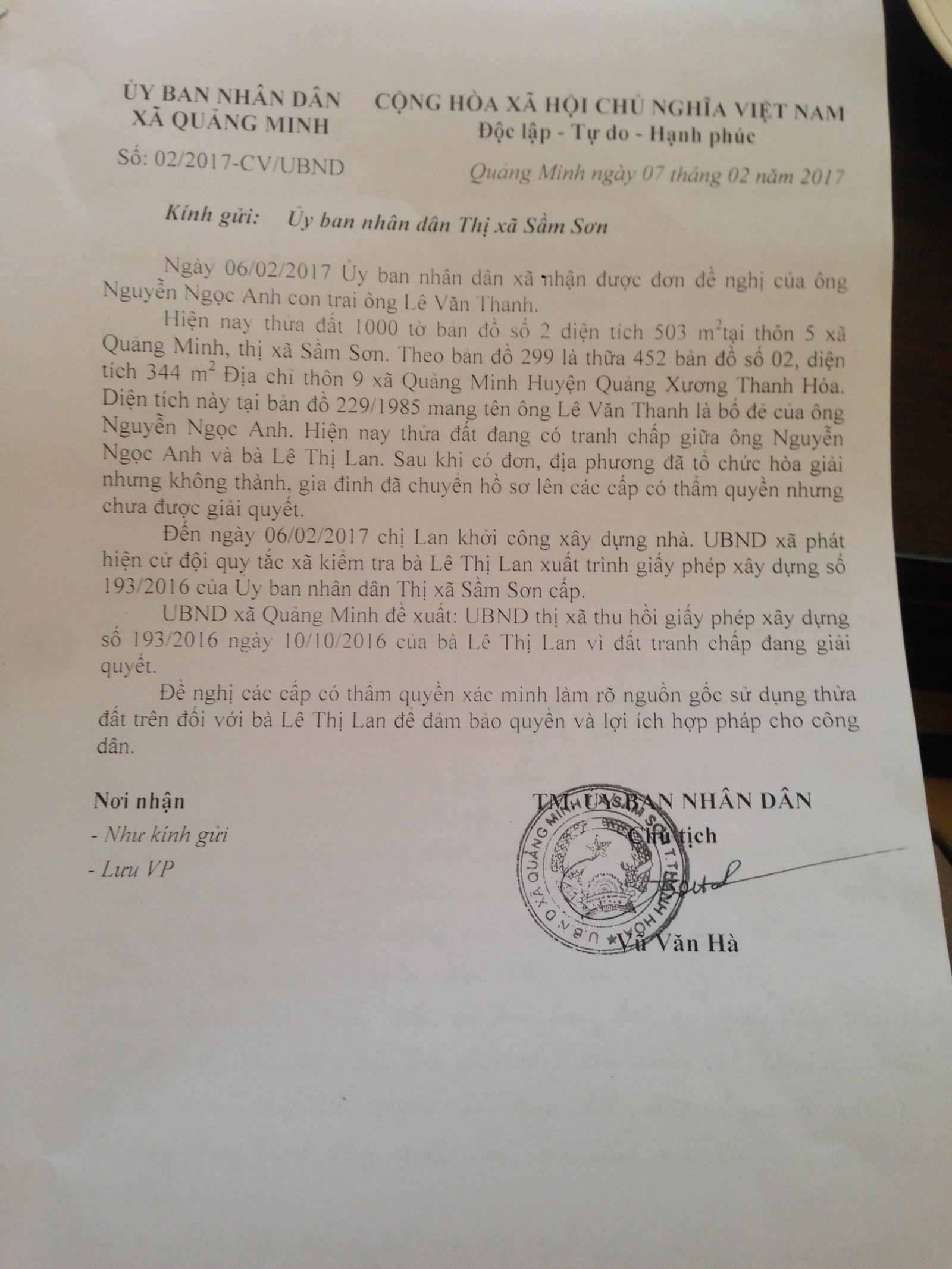 Ngày 28/6/2011 bà Lê Thị Lan, sinh năm 1965 có địa chỉ thôn 5, Quảng Minh được UBND huyện Quảng Xương (nay chuyển về thị xã Sầm Sơn) được cấp giấy chứng nhận quyền sử dụng đất BE 18676 thửa số 1000, tờ bản đồ số 2, diện tích 503 m2, mục đích sử dụng là đất ở nông thôn.