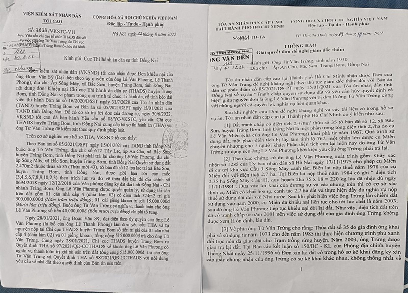 Tiếp đó, ngày 22/8/2022, tại Văn bản số 3038/VLKSTC-V11 gửi Cục THADS tỉnh Đồng Nai về việc “yêu cầu chỉ đạo tổ chức THADS đối với vụ việc ông Từ Văn Trứng, do Chi cục THADS huyện Trảng Bom tổ chức thi hành”, Viện KSND Tối cao có ý kiến: Qua việc kiểm sát hồ sơ thấy Chi cục THADS huyện Trảng Bom ban hành các quyết định THA đúng theo nội dung bản án và đơn yêu cầu THA của người được THA. Trong quá trình tổ chức THA, chấp hành viên đã thực hiện đúng trình tự, thủ tục về THA theo quy định pháp luật; phối hợp với chính quyền địa phương tích cực vận động, thuyết phục người phải THA tự nguyện giao tài sản cho người được THA. Tuy nhiên, người phải THA và gia đình không tự nguyện giao do không đồng tình với quyết định của bản án, liên tục có đơn gửi đến cơ quan có thẩm quyền đề nghị xem xét lại bản án theo thủ tục giám đốc thẩm.