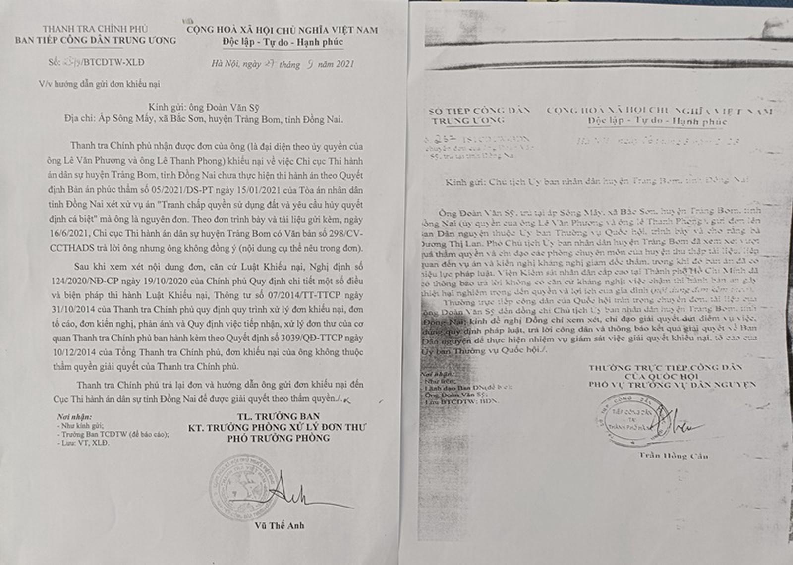 Ông Lê Thanh Phong (con ruột của ông Lê Văn Phương) cho biết, trong khi Bản án phúc thẩm số 05/2021/DS-PT ngày 15/1/2021 của TAND tỉnh Đồng Nai chưa được thực thi theo quy định pháp luật thì ngày 31/5/2021, bà Lương Thị Lan (Phó Chủ tịch UBND huyện Trảng Bom), Trưởng Ban Chỉ đạo THADS huyện ra Thông báo kết luận số 237/TB-BCĐTHA với nội dung xác định thửa đất số 35, tờ bản đồ số 12, tọa lạc tại xã Bắc Sơn (diện tích 2.470 m2) mà gia đình ông vừa thắng kiện ở 2 cấp tòa án trên là… đất công.