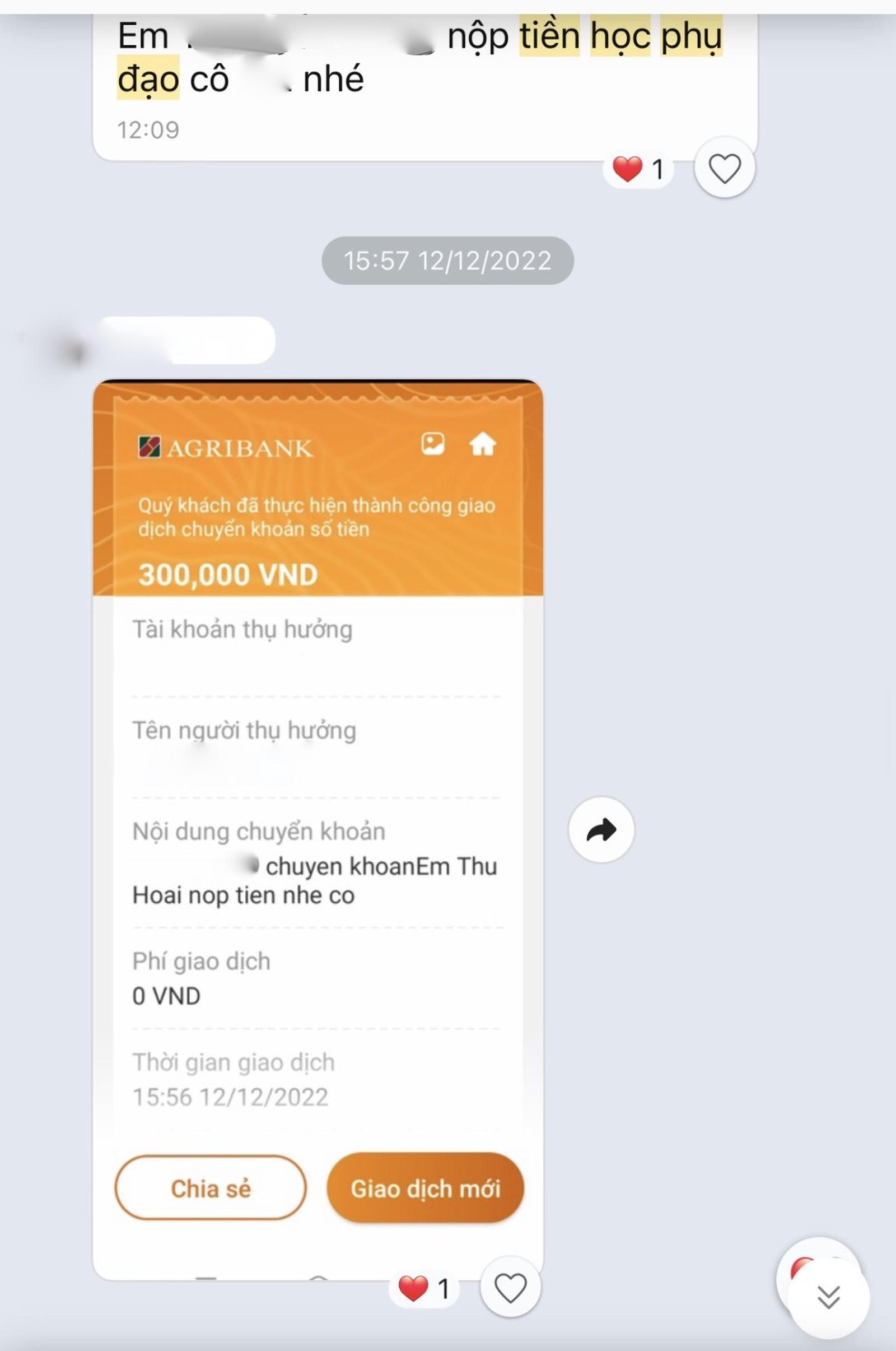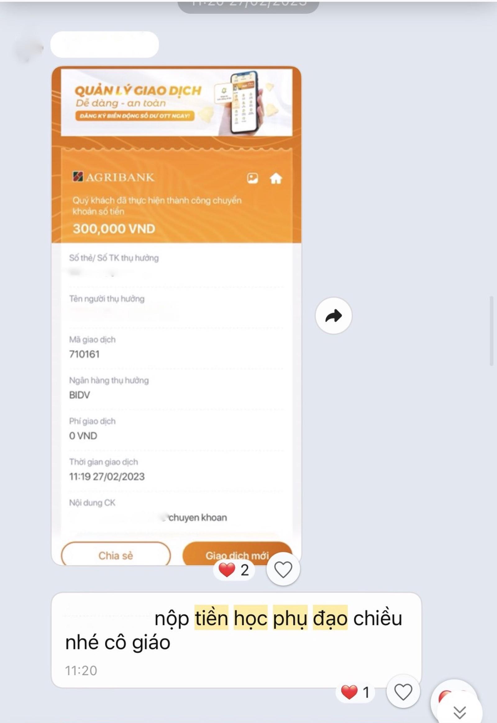 Loạt giao dịch chuyển tiền học thêm của phụ huynh với số tiền 300.000 đồng/tháng tại Trường THCS Cao Bình năm học 2022 - 2023. Ảnh: Quang Dân