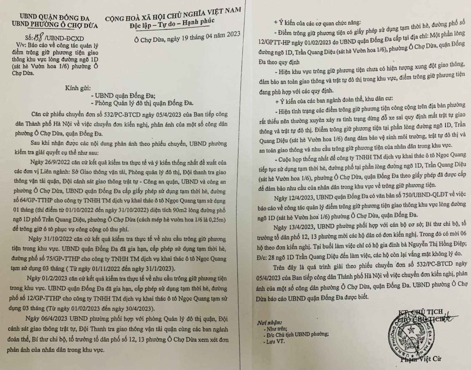 Liên quan đến các kiến nghị, phản ánh của một số người dân tại tổ dân phố 12 và 13, ngày 19/4/2023, UBND phường Ô Chợ Dừa đã có Văn bản số 138/UBND-ĐCXD báo cáo công tác quản lý điểm trông giữ phương tiện giao thông khu vực lòng đường ngõ 1D, phố Trần Quang Diệu gửi UBND quận Đống Đa và Phòng Quản lý đô thị quận.