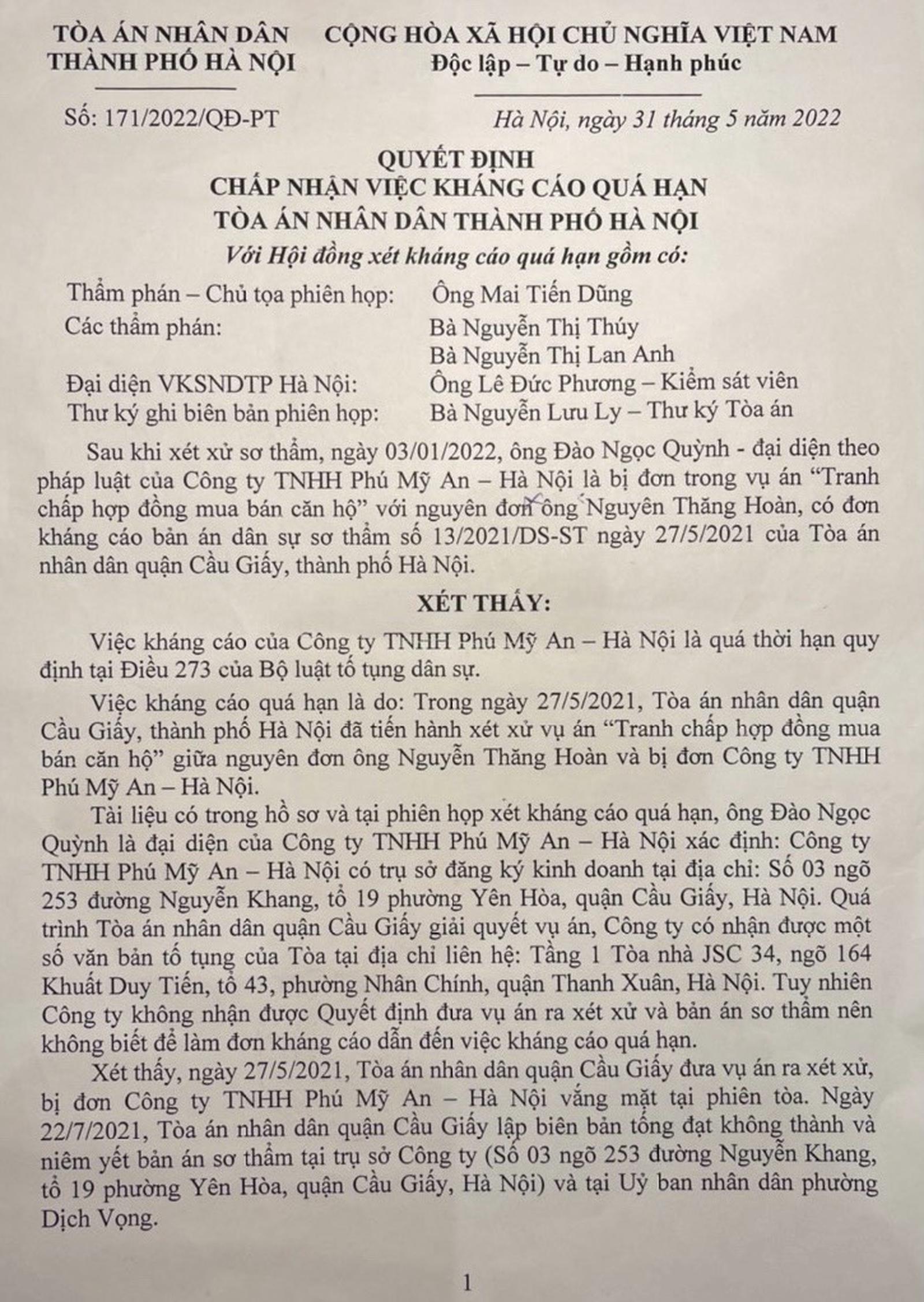 Ngày 31/5/2022, TAND TP Hà Nội ban hành Quyết định số 171/2022/QĐ-PT chấp nhận việc kháng cáo quá hạn của Cty Phú Mỹ An đối với bản án DSST số 13/2021/DS-ST của TAND quận Cầu Giấy do thẩm phán Mai Tiến Dũng ký gửi các cơ quan chức năng và các đương sự trong đó có nội dung: Cty Phú Mỹ An có trụ sở đăng ký kinh doanh tại địa chỉ số 3, ngõ 253, đường Nguyễn Khang, tổ 19, Yên Hòa, quận Cầu Giấy.