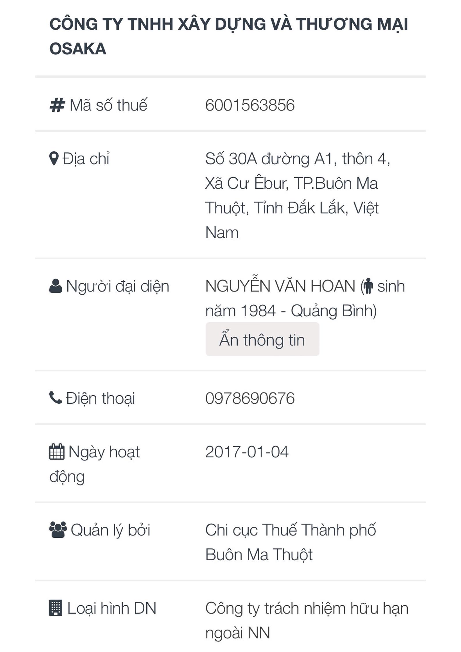 Theo thông tin trên cổng thông tin đấu thầu quốc gia, Công ty TNHH Xây dựng và Thương mại OSAKA (địa chỉ tại xã Cư Êbur, TP Buôn Ma Thuột, Đắk Lắk), được thành lập ngày 4/1/2017.