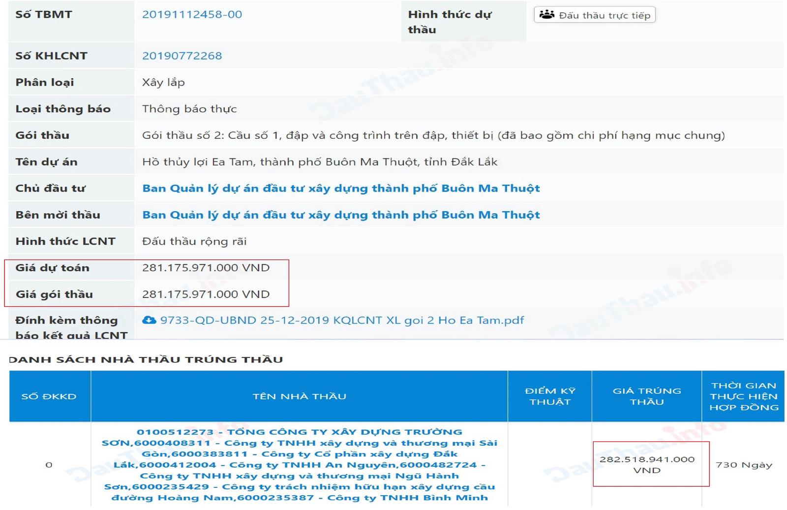 Có nhiều gói thầu “khủng” về tay doanh nghiệp này và các nhà thầu liên doanh như: Gói thầu Thi công xây dựng công trình (Tiểu dự án giải phóng mặt bằng, khu tái định cư phía Đông hồ Trung tâm và đường D2, thuộc dự án Hồ Gia Nghĩa, thị xã Gia Nghĩa, Đắk Nông), do Ban QLDA và phát triển quỹ đất thị xã Gia Nghĩa mời thầu, vào năm 2019. Giá trị gói thầu 114.199.479.000 đồng, giá trúng thầu 114.108.296.000 đồng, tiết kiệm thầu chỉ hơn 91 triệu đồng.