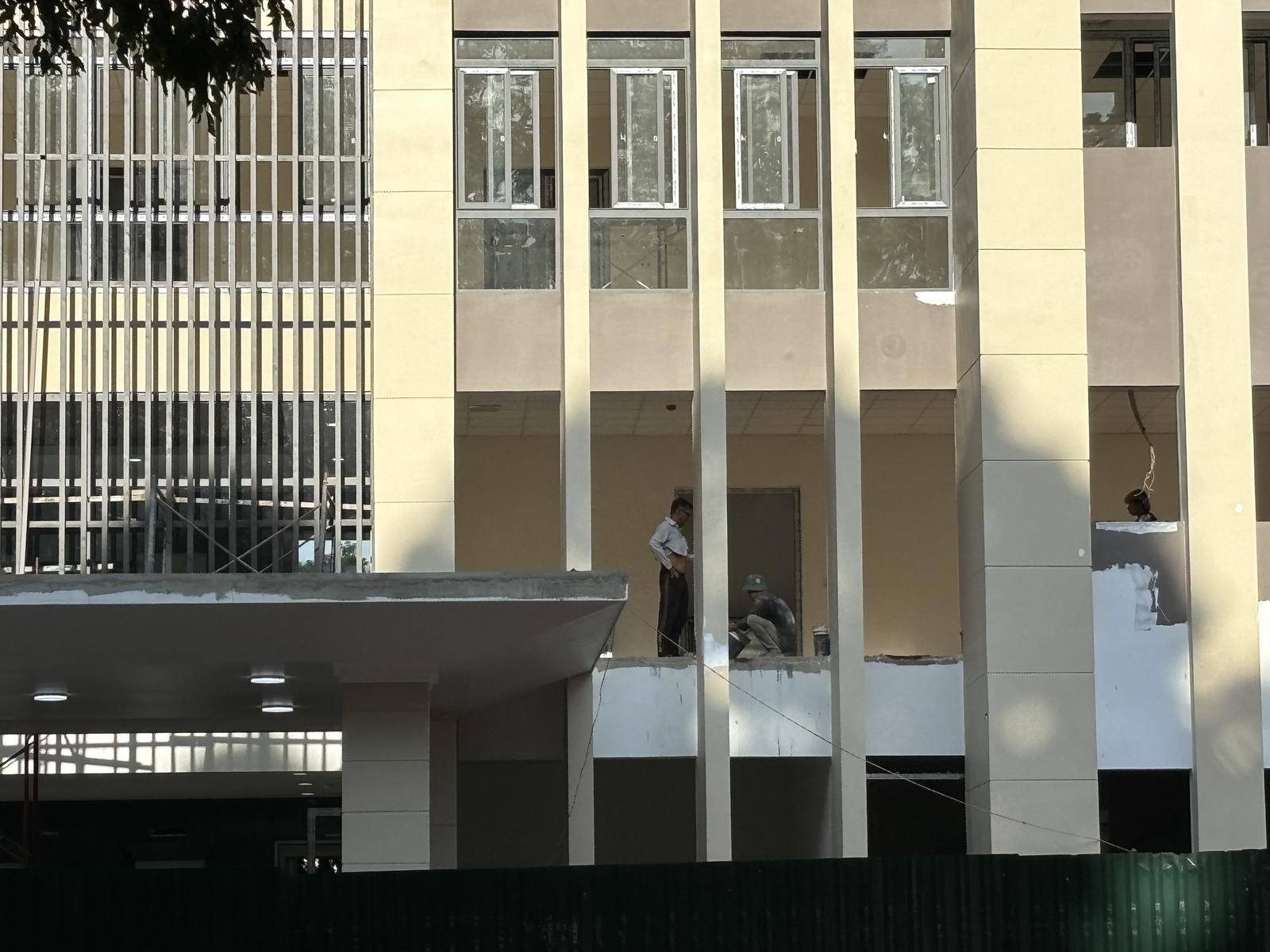 Công nhân của Công ty Cổ phần Xây dựng Đắk Lắk ngồi chênh vênh ở trên tầng mà không hề có bất cứ trang thiết bị bảo hộ lao động nào. Ảnh: Anh Minh
