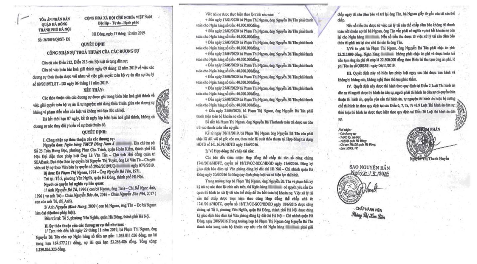 Tại Quyết định số 26/2019/QĐST-DS của TAND quận Hà Đông về “công nhận sự thoả thuận của các đương sự” đã thể hiện: Tạm tính đến ngày 29/11/2019, bà Ngoan và ông Tân đang còn khoản nợ ngân hàng số tiền 1.280.855.323 đồng (bao gồm nợ gốc, nợ lãi trong hạn và nợ lại quá hạn); việc trả nợ được thực hiện theo lộ trình từ 17/01/2020 - 25/08/2020, gia đình ông Tân và bà Ngoan phải trả cho ngân hàng mỗi tháng 40 triệu, đến ngày 25/09/2020 ông Tân và bà Ngoan phải trả dứt điểm số nợ còn lại.