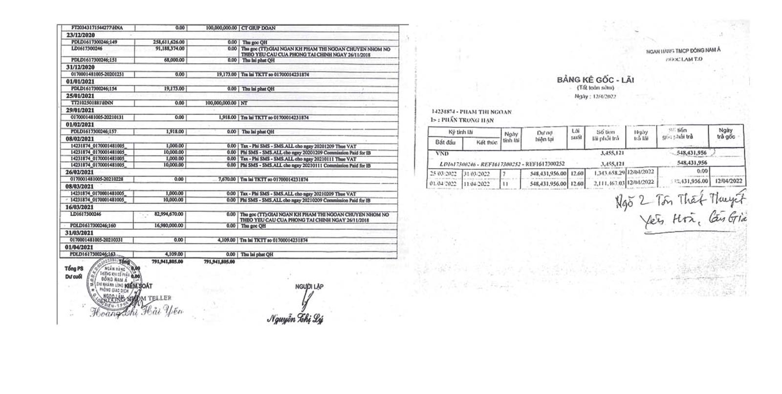 Theo lịch sử giao dịch được cung cấp bởi ngân hàng mà ông Tân bà Ngoan vay vốn, đến 01/04/2022 khoản nợ của gia đình chỉ còn 548.431.956 đồng.