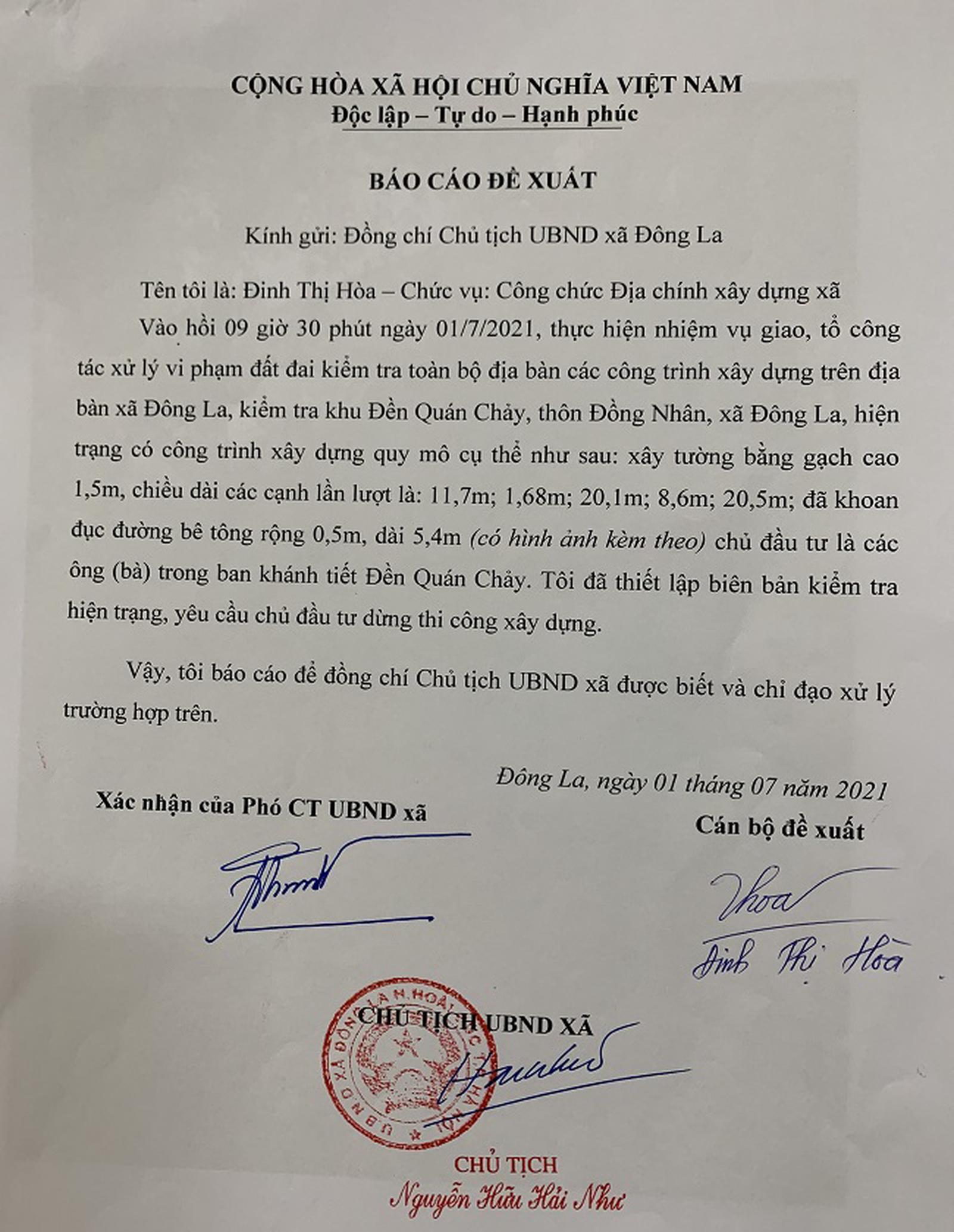 Ngày 1/7/2021, bà Đinh Thị Hòa, cán bộ công chức địa chính xây dựng xã đã có báo cáo đề xuất về việc Ban Khánh tiết, đền Quán Chảy xây dựng 62,58m tường, cao 1,5m trái phép vi phạm pháp luật gửi Chủ tịch UBND xã Nguyễn Hữu Hải Như để biết, chỉ đạo xử lý vụ việc.
