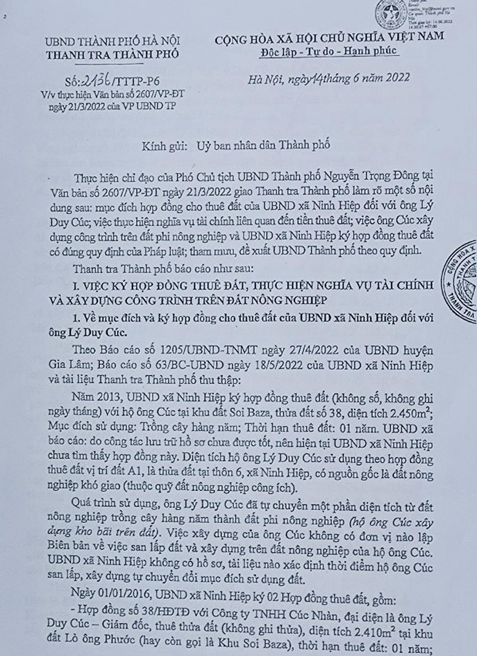 Ngày 14/6/2022, Thanh tra TP có Văn bản số 2136/TTTP-P6 gửi UBND TP Hà Nội, kiến nghị UBND TP giao UBND huyện Gia Lâm tổ chức xử lý triệt để trường hợp vi phạm xây dựng trên đất nông nghiệp của hộ ông Lý Duy Cúc.