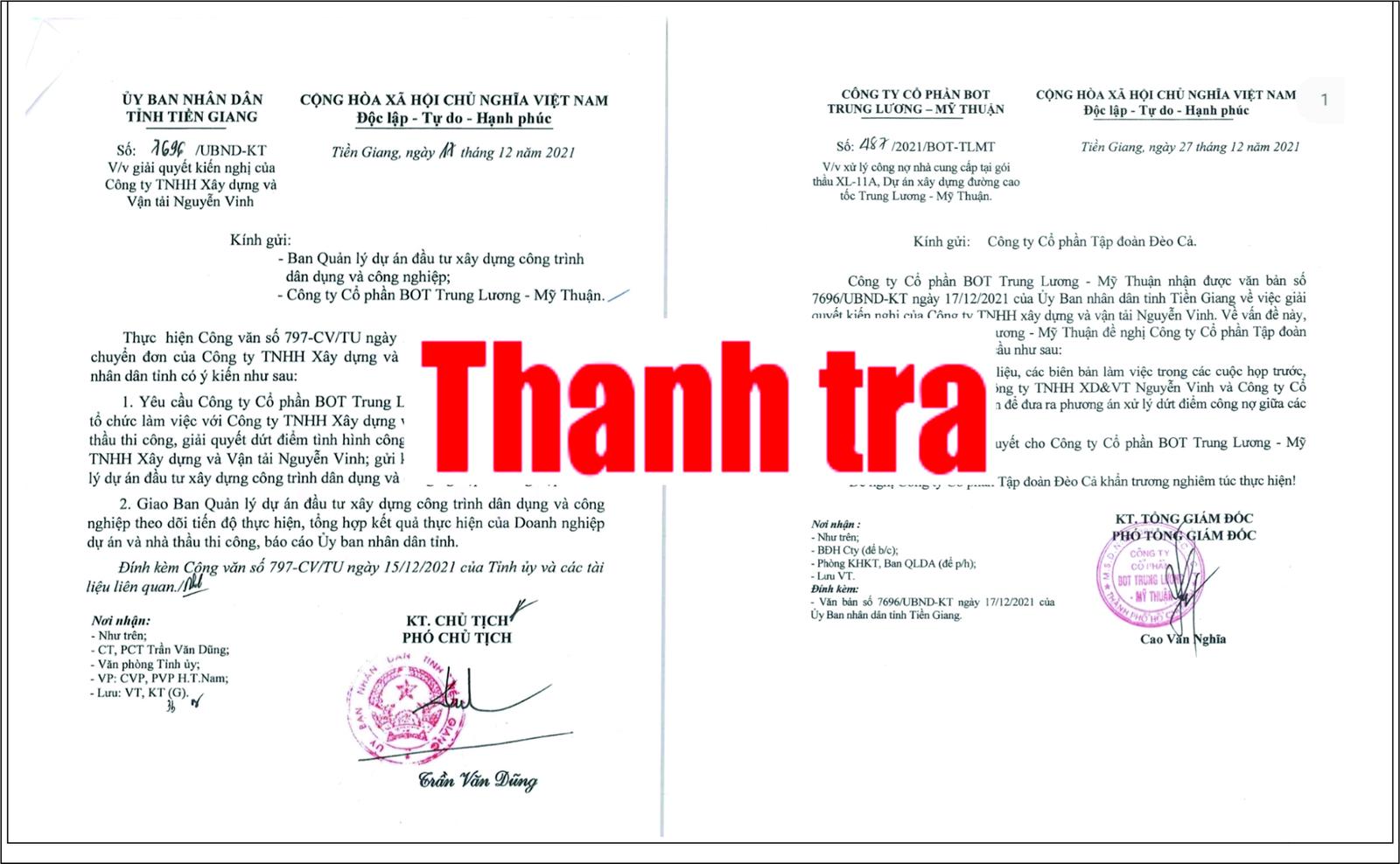 Văn bản của UBND tỉnh Tiền Giang và Công ty CP BOT Trung Lương - Mỹ Thuận yêu cầu các đơn vị, Tập Đoàn Đèo Cả phối hợp, rà soát đưa ra phương án xử lý dứt điểm công nợ giữa các bên liên quan. Ảnh: Đ.M