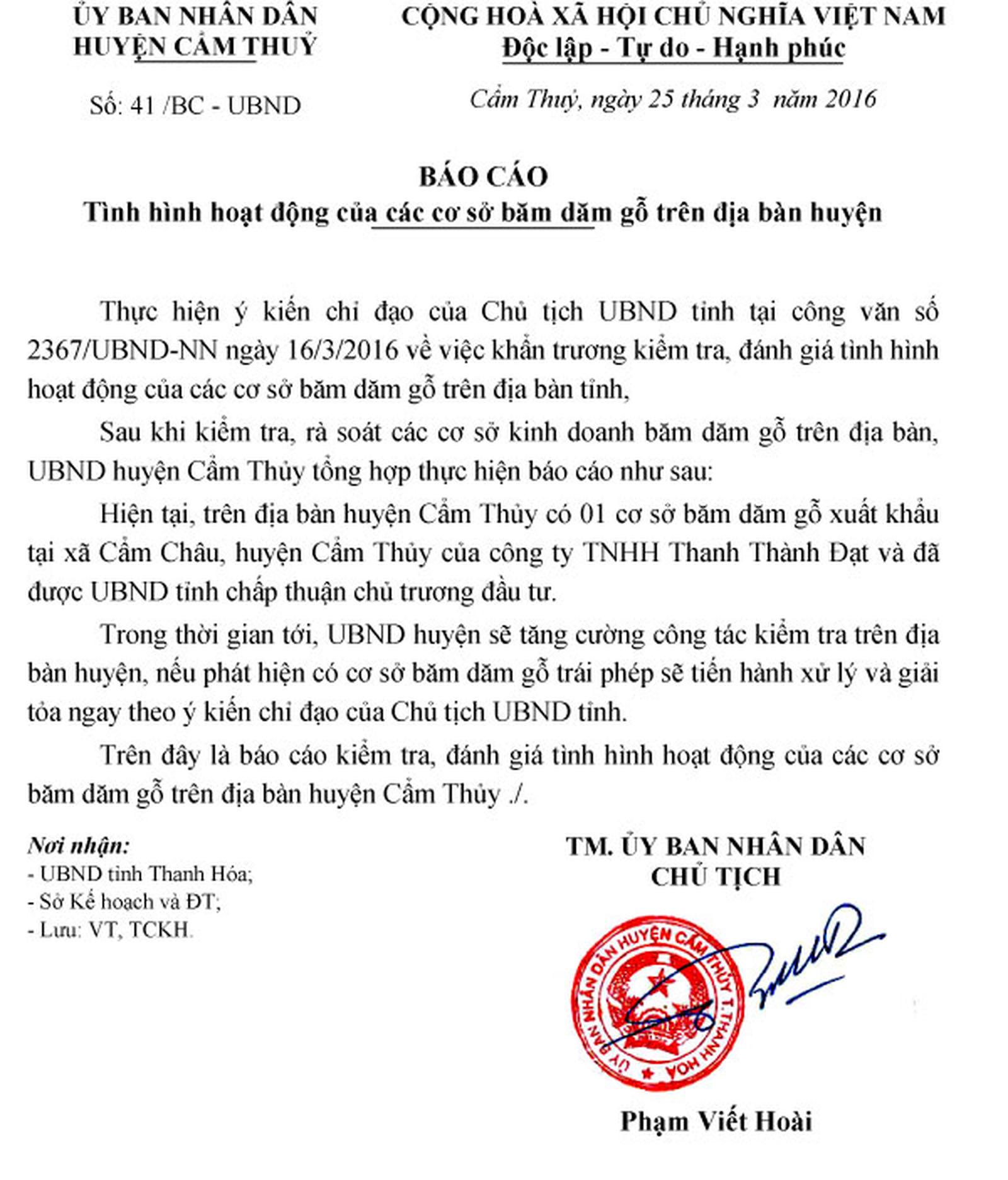 Mặc dù trên địa bàn có tới 3 cơ sở băm dăm, nhưng văn bản Chủ tịch huyện Cẩm Thủy lại chỉ báo cáo có 1 cơ sở du nhất. Ảnh: Văn Thanh