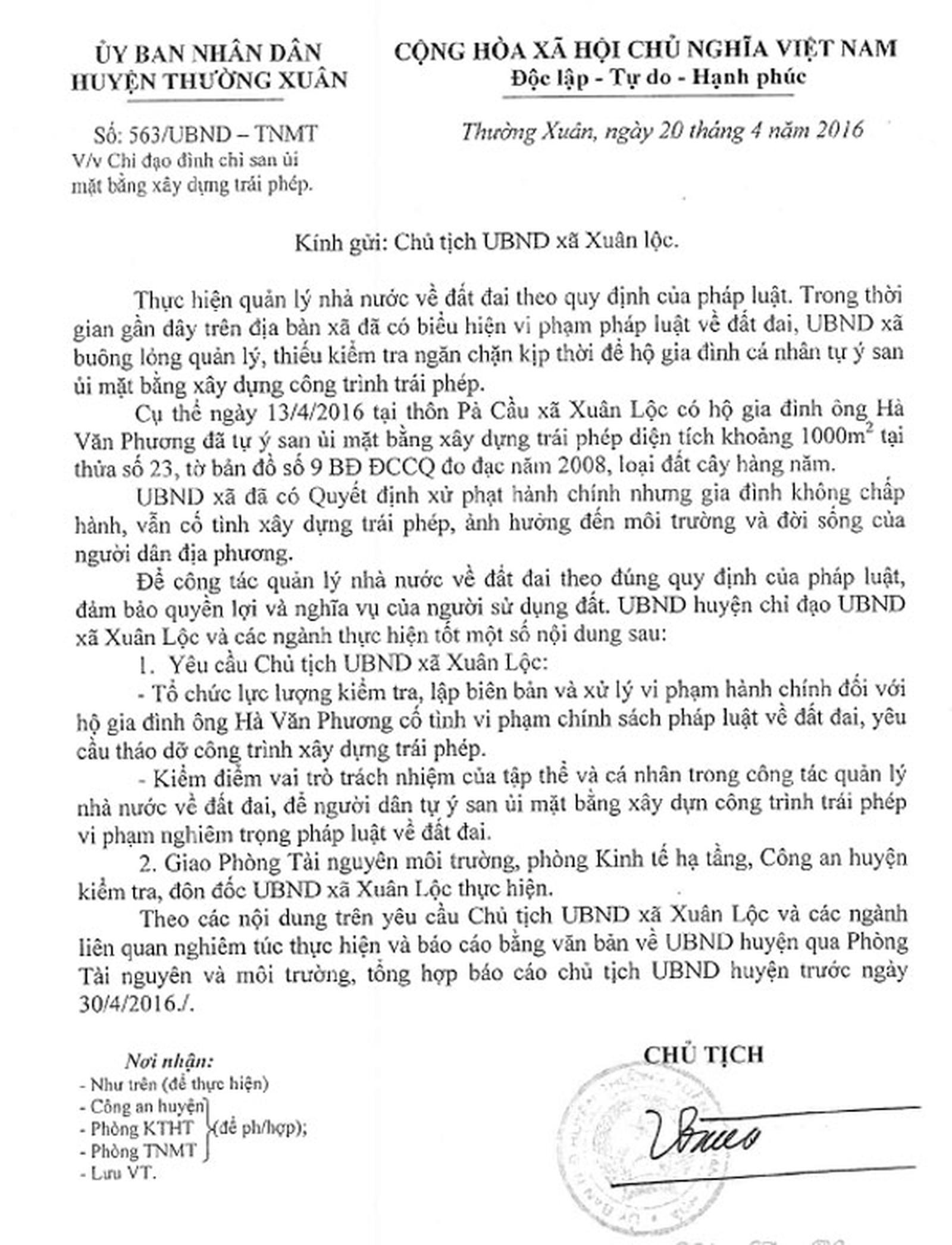 Ông Cầm Bá Xuân - Chủ tịch UBND huyện Thường Xuân đã ký văn bản chỉ đạo Chủ tịch xã Xuân Lộc đình chỉ, kiểm tra, lập biên bản hành chính về việc một hộ dân cố tình vi phạm Luật Đất đai, đồng thời yêu cầu địa phương tháo dỡ công trình xưởng gỗ dăm trái phép mà Báo Thanh tra đã phản ánh. Theo đó, tiến hành kiểm điểm vai trò, trách nhiệm tập thể, cá nhân trong công tác quản lý Nhà nước về đất đai, để người dân tự san ủi mặt bằng xây dựng xưởng gỗ dăm không phép trên địa bàn.