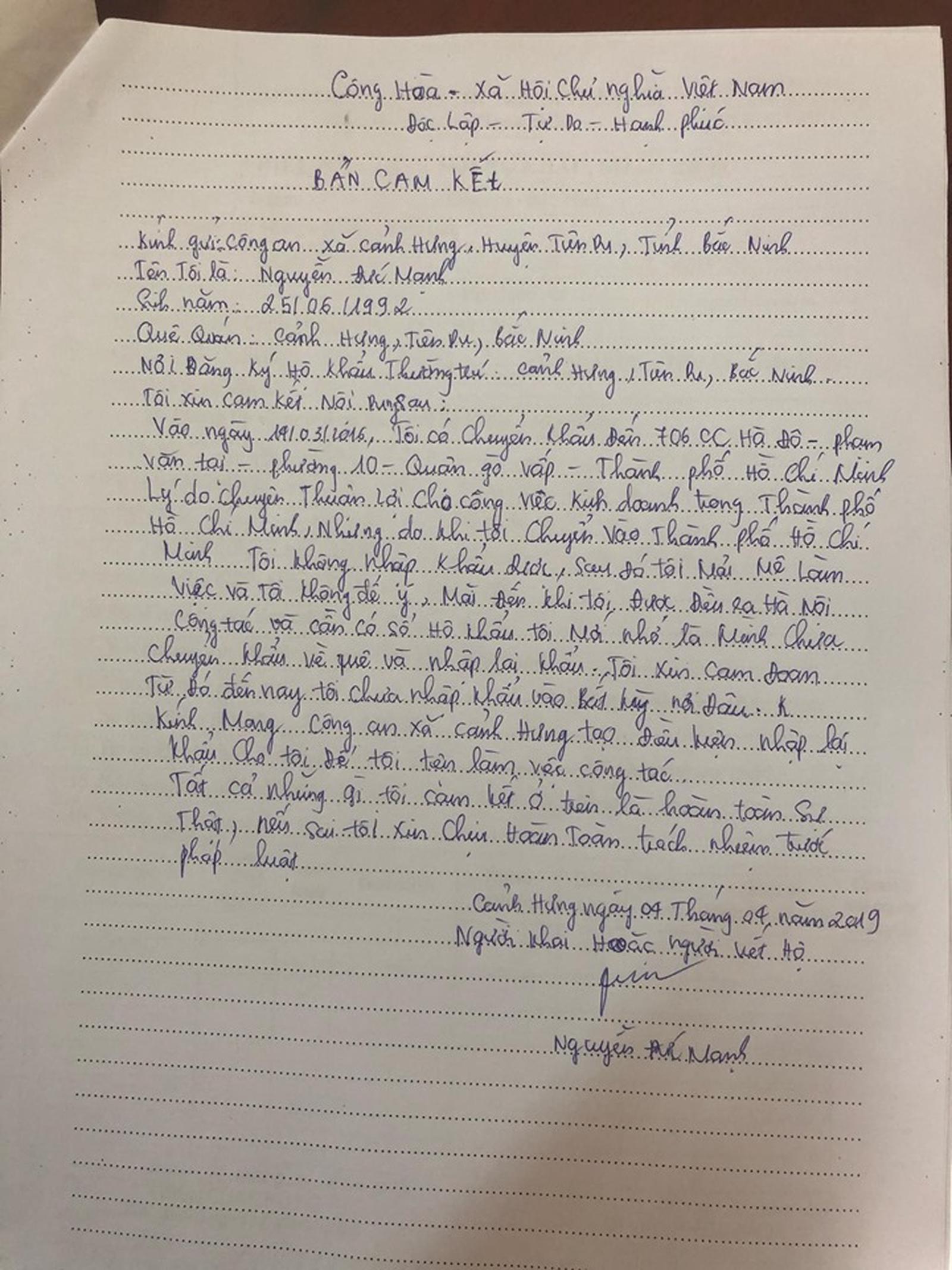 Bản khai của Nguyễn Đức Mạnh. Mạnh là cháu họ ông Khoáng sống cùng thôn Trung, đã được ông Khoáng ký cắt khẩu treo rồi được ký đăng ký kết hôn. Năm 2019, Mạnh hết tuổi đi nghĩa vụ quân sự mới xin nhập về bằng bản khai này, nhưng ngày 3/3/2017 Mạnh đã được đăng ký kết hôn vì vẫn còn khẩu ở địa phương mà nói ông Khoáng vô can thì là chuyện lạ.