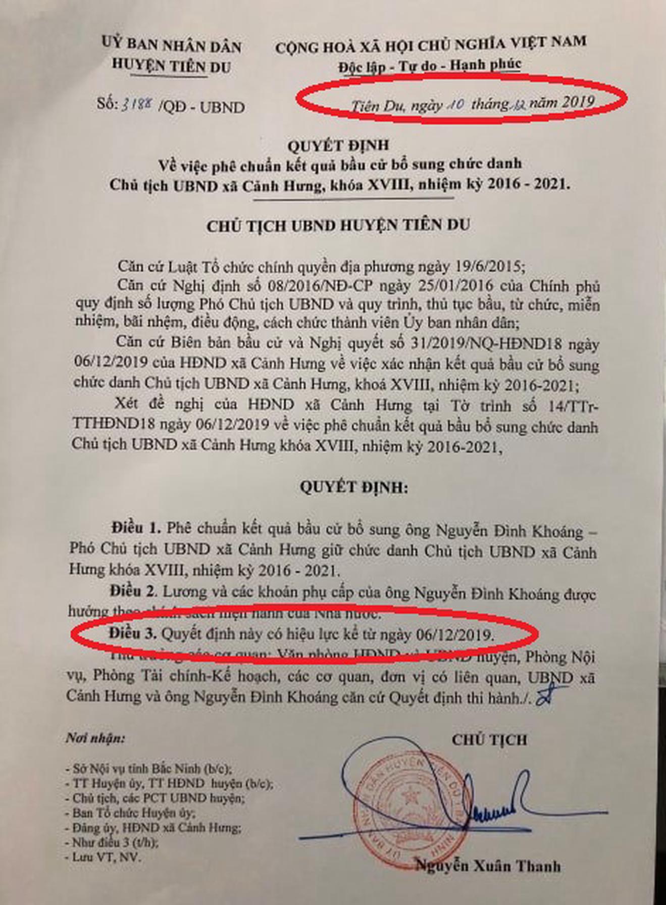 Quyết định của Chủ tịch UBND huyện Tiên Du có hiệu lực trước ngày ký 4 ngày. Ảnh: ND