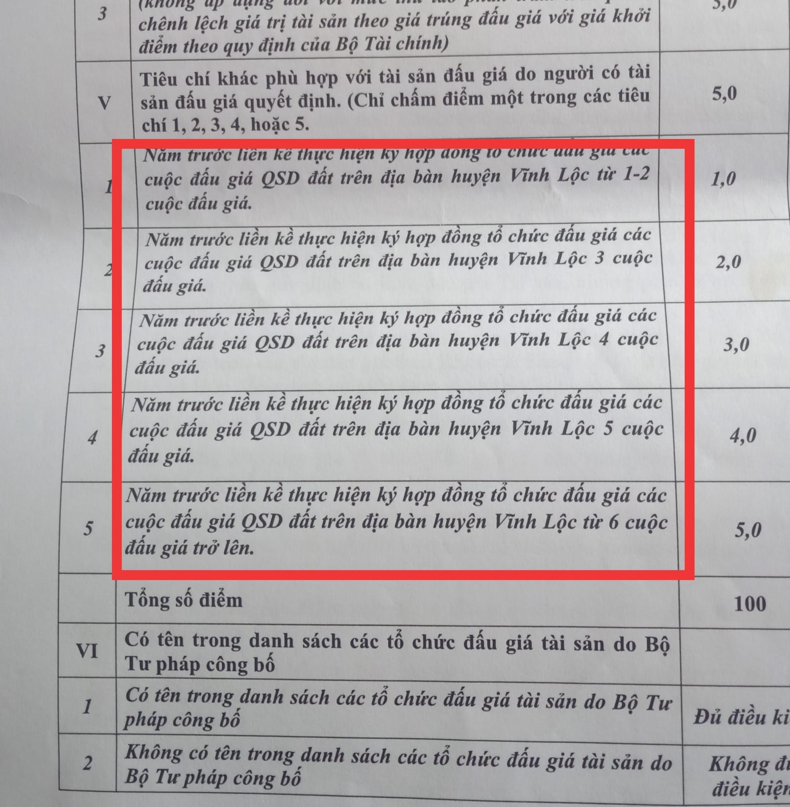 Tiêu chí thứ nhất “năm trước liền kề thực hiện ký hợp đồng tổ chức đấu giá các cuộc đấu giá QSDĐ trên địa bàn huyện Vĩnh Lộc từ 1-2 cuộc đấu giá thì được chấm mức tối đa là 1 điểm”; tiêu chí thứ 2 “năm trước liền kề thực hiện ký hợp đồng tổ chức đấu giá các cuộc đấu giá QSDĐ trên địa bàn huyện Vĩnh Lộc từ 3 cuộc đấu giá thì được chấm mức tối đa là 2 điểm”; tiêu chí thứ 3 “năm trước liền kề thực hiện ký hợp đồng tổ chức đấu giá các cuộc đấu giá QSDĐ trên địa bàn huyện Vĩnh Lộc từ 4 cuộc đấu giá thì được chấm mức tối đa là 3 điểm”; tiêu chí thứ 4 “năm trước liền kề thực hiện ký hợp đồng tổ chức đấu giá các cuộc đấu giá QSDĐ trên địa bàn huyện Vĩnh Lộc từ 5 cuộc đấu giá thì được chấm mức tối đa là 4 điểm”; tiêu chí thứ 5 “năm trước liền kề thực hiện ký hợp đồng tổ chức đấu giá các cuộc đấu giá QSDĐ trên địa bàn huyện Vĩnh Lộc từ 6 cuộc đấu giá thì được chấm mức tối đa là 5 điểm” (chỉ chấm 1 trong 5 các tiêu chí nói trên).