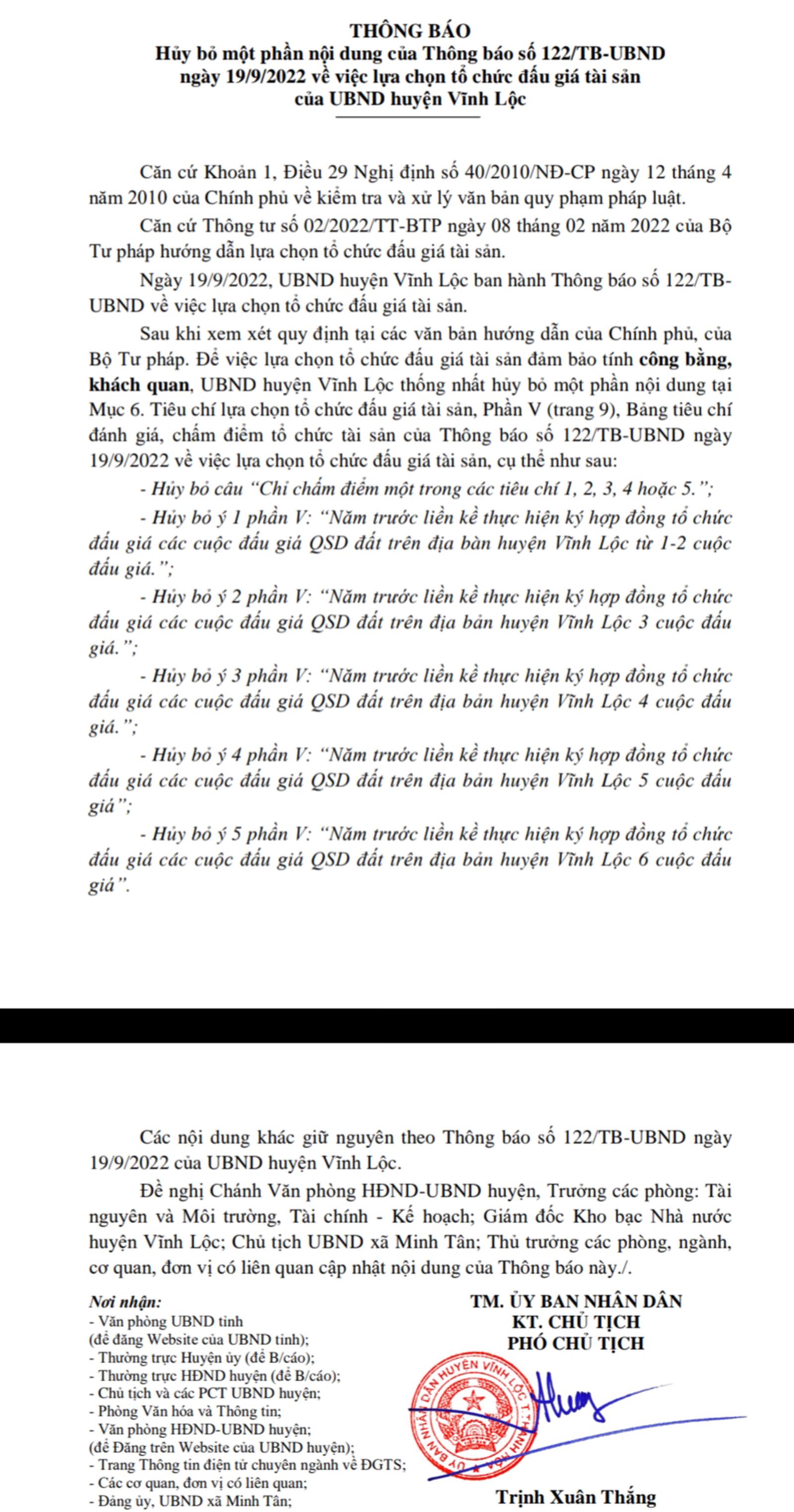Trước những thông tin trái chiều này, ngày 21/9/2022, tức sau 3 ngày ban hành thông báo lựa chọn tổ chức tổ chức đấu giá QSDĐ 73 lô đất ở xã Minh Tân thì ông Trịnh Xuân Thắng, Phó Chủ tịch UBND huyện Vĩnh Lộc đã ký Văn bản hủy bỏ cả 5 tiêu chí trong mục V của Thông báo số 124 ngày 19/9/2022 do Chủ tịch UBND huyện Vĩnh Lộc ký ban hành. Các nội dung khác của thông báo này vẫn giữ nguyên để lựa chọn khách quan đơn vị tổ chức đấu giá tài sản QSDĐ ở xã Minh Tân.