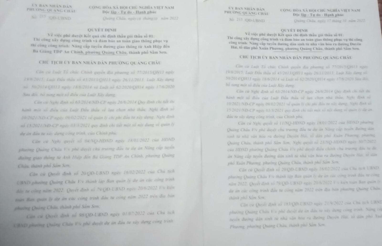 Ngày 18/10/2022, ông Đồng ký Quyết định số 215/QĐ-UBND phê duyệt chỉ định thầu gói thầu số 01 thi công xây dựng công trình và đảm bảo an toàn giao thông phục vụ thi công công trình nâng cấp tuyến đường giao thông từ An Hiệp đến Bà Giảng, tổ dân phố An Chính, phường Quảng Châu, TP Sầm Sơn cho Công ty Hồng Đức thi công với giá chỉ định thầu 414.883.000 đồng, bằng nguồn vốn ngân sách phường Quảng Châu và huy động hợp pháp khác.