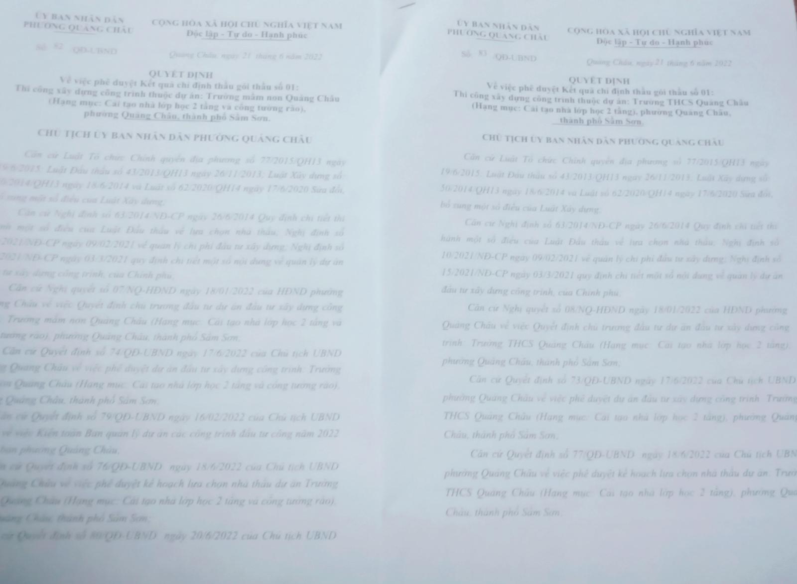 Cũng trong ngày 21/6/2022, ông Mai Thành Đồng đã ký Quyết định số 83/QĐ-UBND phê duyệt kết quả chỉ định thầu gói thầu số 01 thi công xây dựng công trình thuộc Dự án Trường THCS Quảng Châu (hạng mục cải tạo nhà lớp học 2 tầng), phường Quảng Châu, TP Sầm Sơn cho đơn vị thi công là Công ty Hồng Đức; giá chỉ định thầu là 342.674.000 đồng.