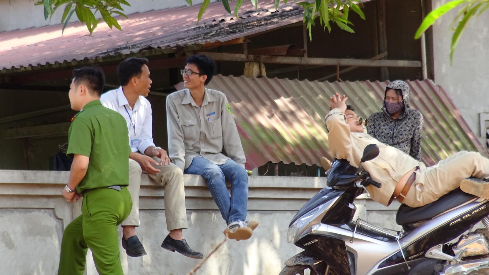 Đội cưỡng chế ngồi cách xa hiện trường vụ cưỡng chế và có những cử chỉ, việc làm không đúng nguyên tắc khi thực hiện nhiệm vụ. Ảnh: Người dân cung cấp