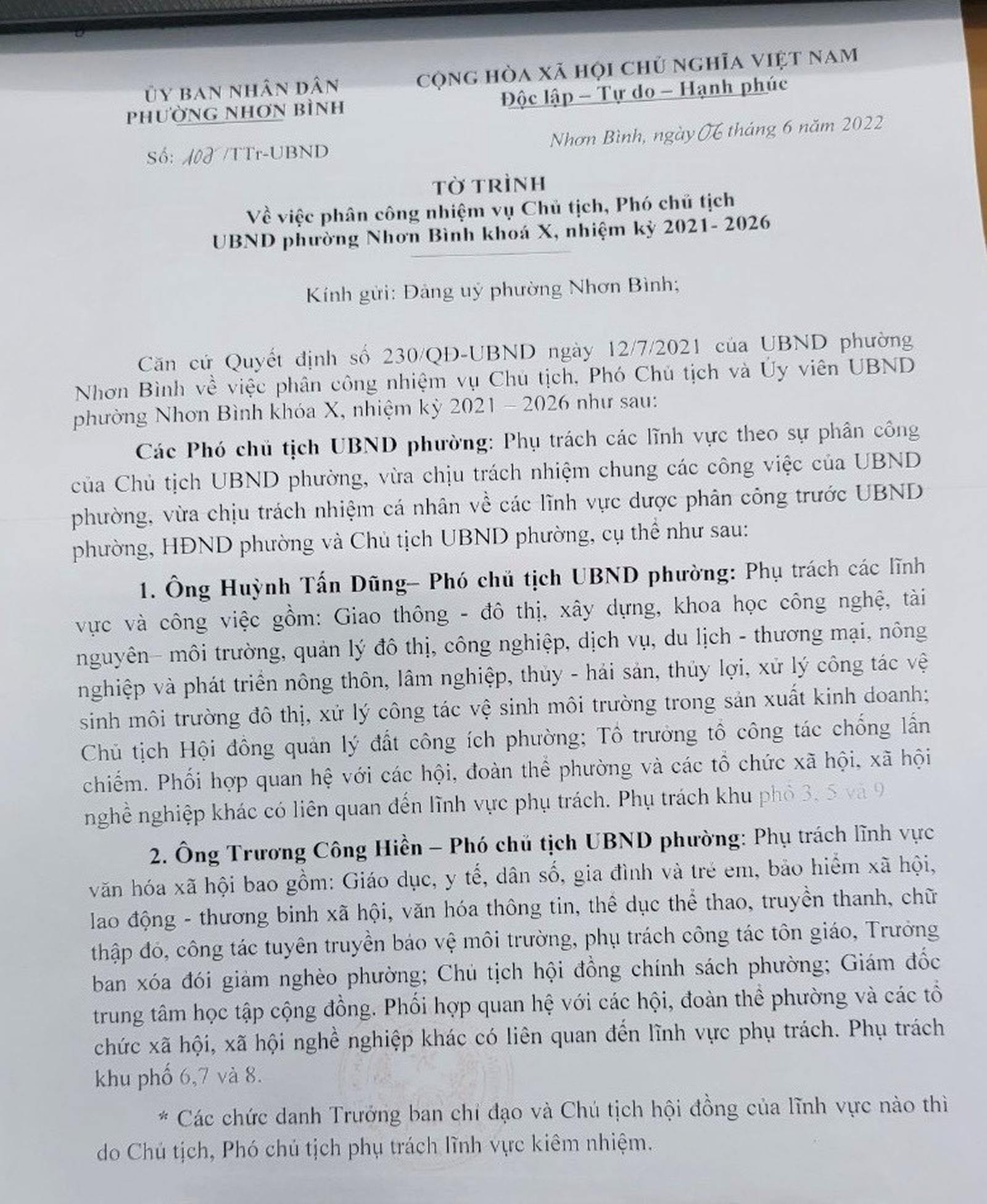 Tại Tờ trình số 107/TTr-UBND ngày 6/6/2022 của Chủ tịch UBND phường Nhơn Bình Đỗ Xuân Nhất về việc phân công nhiệm vụ Chủ tịch, Phó Chủ tịch UBND phường Nhơn Bình khóa X, nhiệm kỳ 2021 - 2026, có nội dung: “Để đảm bảo hoàn thành tốt các nhiệm vụ của UBND phường, UBND phường kính trình Đảng ủy phường xem xét, thống nhất chuyển nhiệm vụ đối với 2 đồng chí Phó Chủ tịch UBND phường” với lý do: “Qua thời gian lãnh đạo và điều hành công việc của UBND thực hiện nhiệm vụ và quyền hạn quy định nhưng không hiệu quả”.
