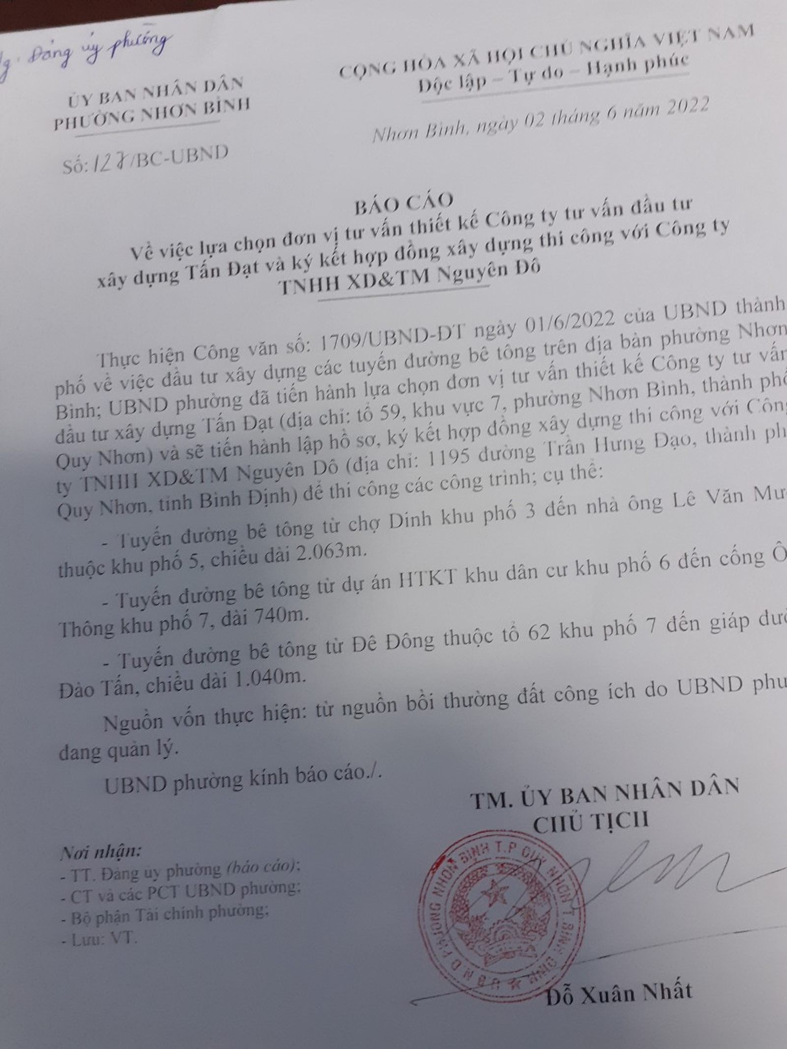 Trước đó, vào ngày 2/6, ông Đỗ Xuân Nhất cũng đã ban hành Văn bản số 127/BC-UBND về việc tiến hành lựa chọn đơn vị tư vấn thiết kế là Công ty Tư vấn Đầu tư Xây dựng Tấn Đạt đồng thời ký kết hợp đồng xây dựng thi công với Công ty TNHH XD & TM Nguyên Đô nhằm thực hiện việc đầu tư xây dựng các tuyến đường bê tông trên địa bàn phường Nhơn Bình (theo Công văn số 1709/UBND-ĐT của UBND thành phố Quy Nhơn ký vào ngày 1/6/2022).
