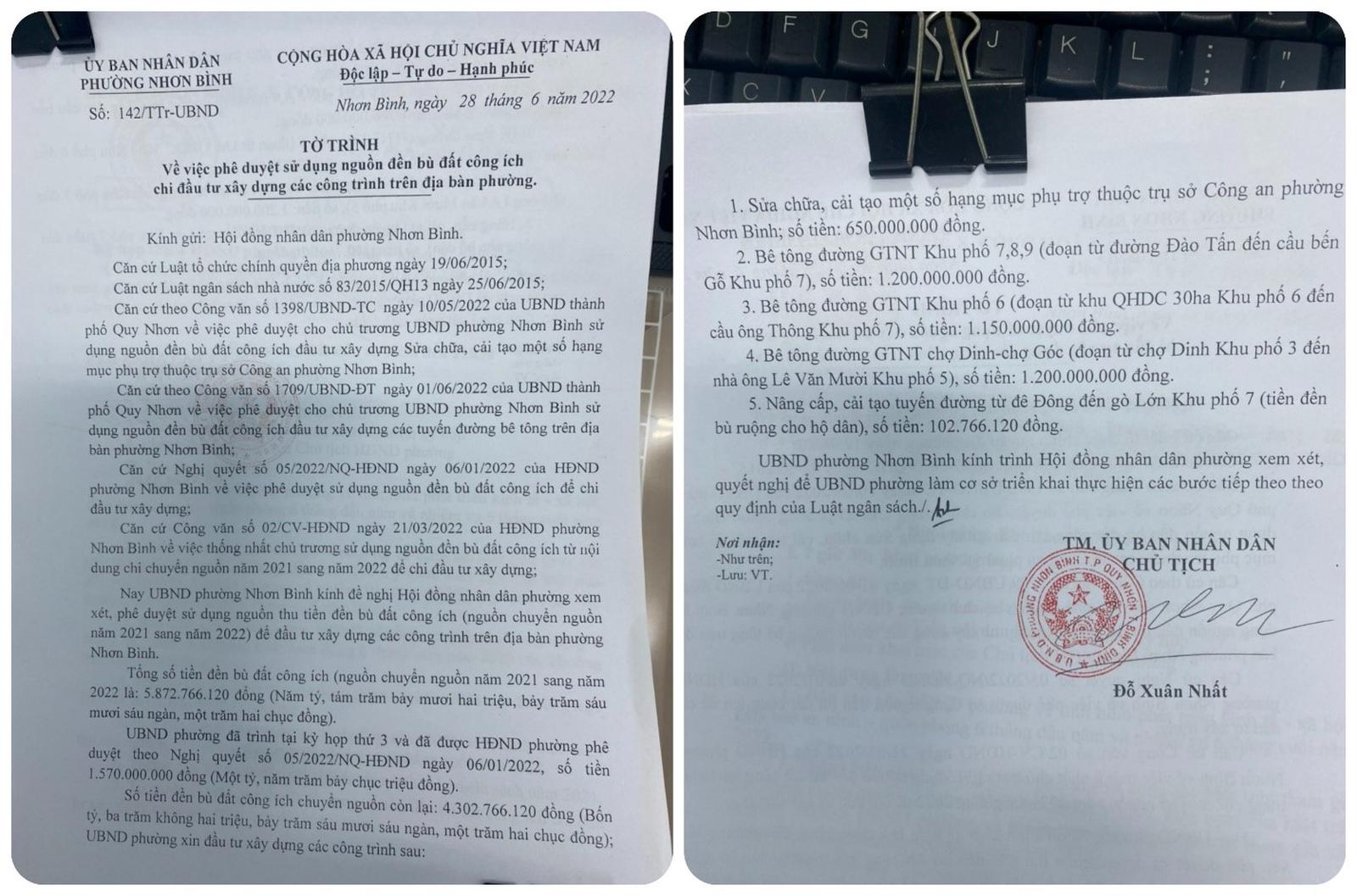 Tờ trình số 142/TTr-UBND về việc phê duyệt sử dụng nguồn đền bù đất công ích phục vụ việc xây dựng các tuyến đường bê tông trên địa bàn phường Nhơn Bình. Ảnh: Ngọc Hoan