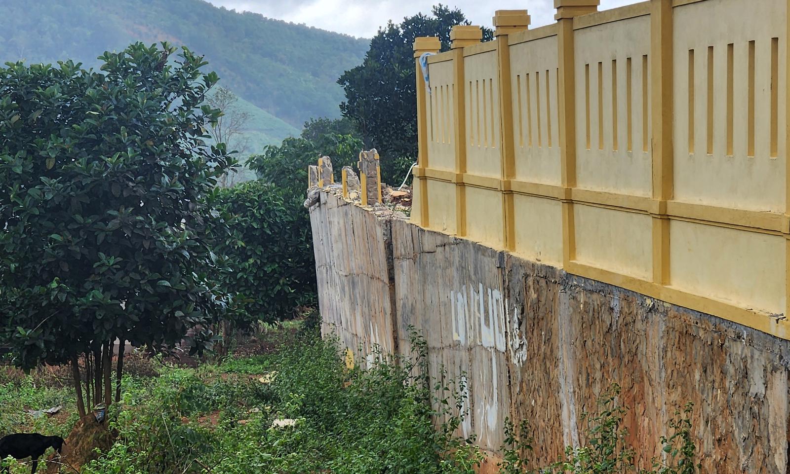 Tường rào tại dự án trụ sở UBND xã Hướng Phùng do Ban QLDA huyện Hướng Hóa làm chủ đầu tư, dù vừa nghiệm thu nhưng bị hư hại nghiêm trọng. Ảnh: Minh Tân
