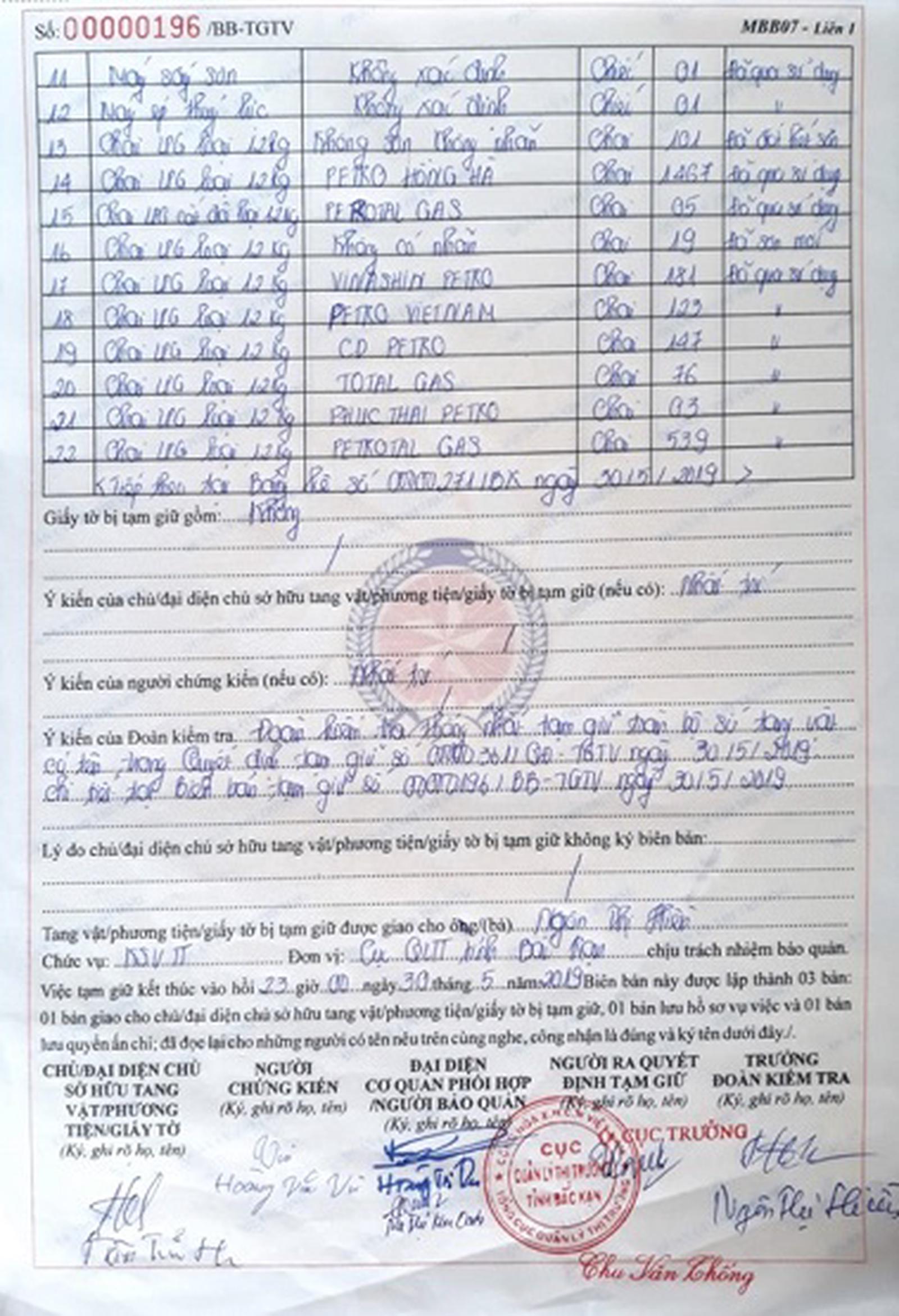 Biên bản tạm giữ tang vật có dấu hiệu vi phạm pháp luật của Công ty CP gas Khánh Linh. Ảnh: TN