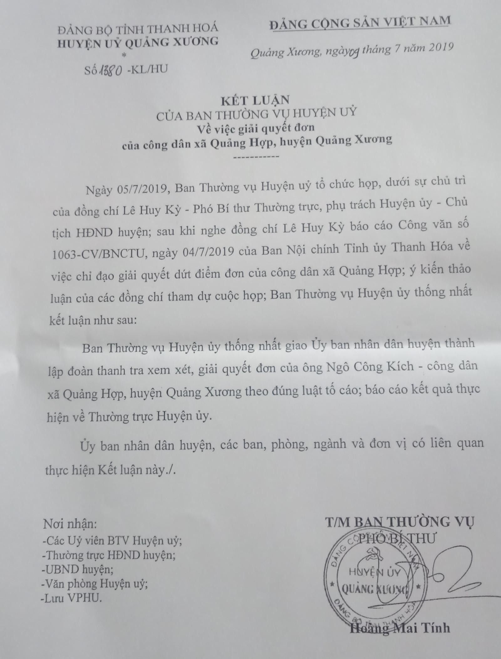 Ông Lê Huy Kỳ, quyền Bí thư Huyện ủy Quảng Xương cho biết: Sau khi nhận được văn bản của Ban Nội chính Tỉnh ủy Thanh Hóa chỉ đạo giải quyết dứt điểm đơn thư cùa công dân, Thường vụ Huyện ủy Quảng Xương đã họp, thống nhất giao UBND huyện thành lập đoàn thanh tra xem xét, giải quyết đơn thư của công dân theo quy định của Luật Tố cáo.