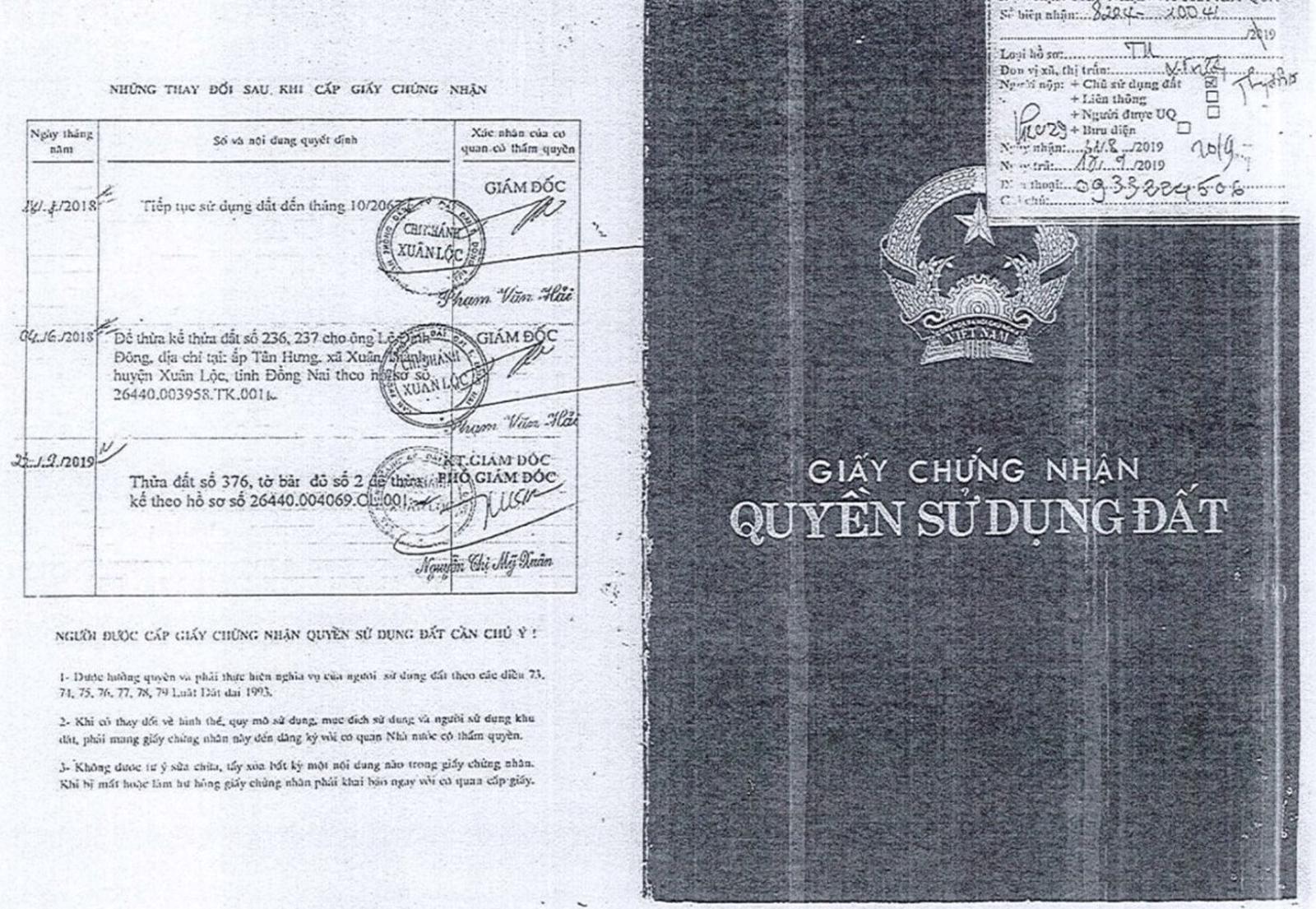 Đến năm 2018, gia đình mới thống nhất chia tài sản thừa kế cho ông Lê Đình Đức là toàn bộ thửa đất số 376 và được Sở Tài nguyên và Môi trường tỉnh Đồng Nai cấp lại GCNQSDĐ năm 2019 với diện tích 2.138,5m2 thuộc thửa đất 23, tờ bản đồ 06 (thửa 376 cũ) và ông Lê Trọng Đại là người ký giáp ranh.