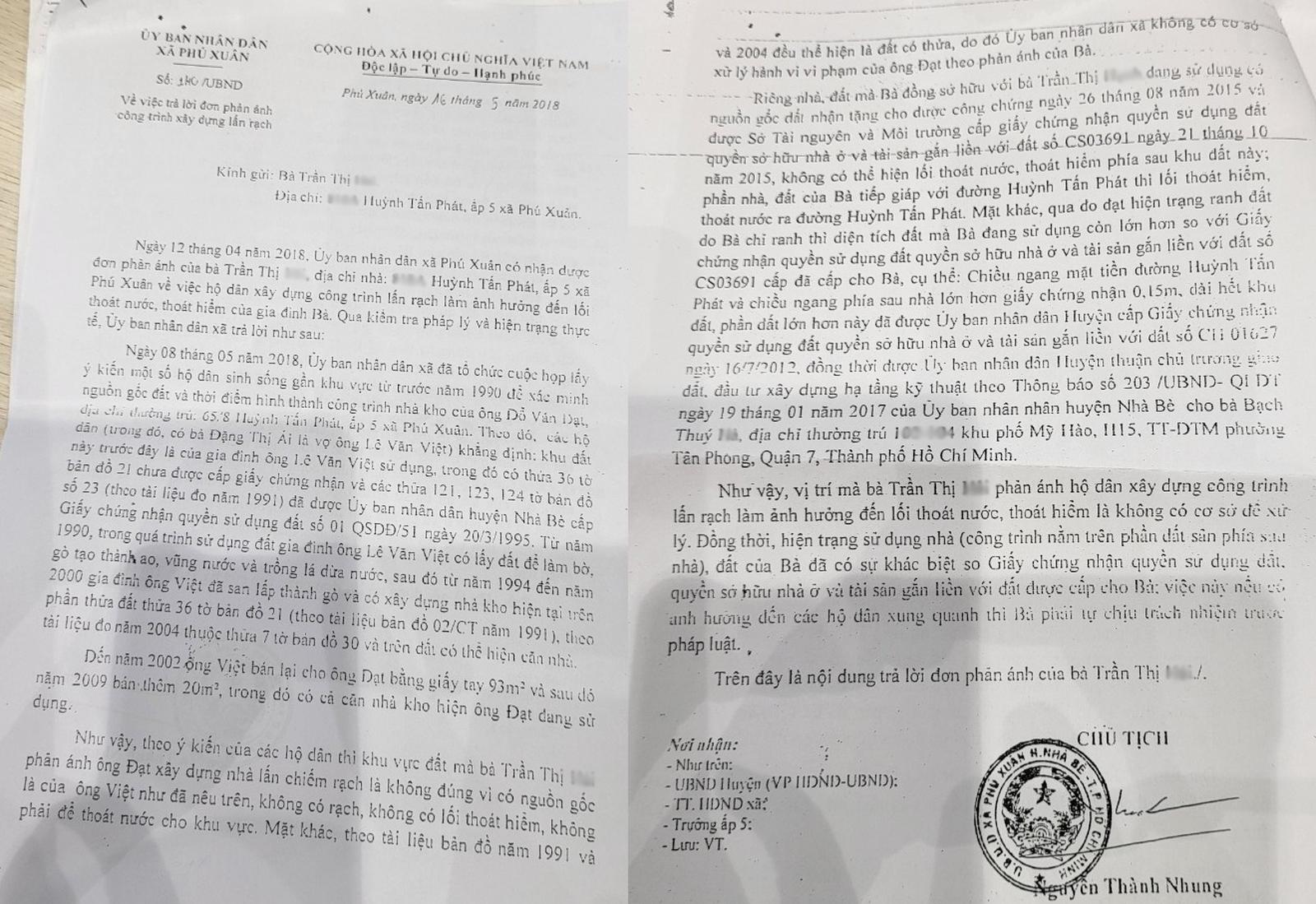 “Vụ bà H. làm đơn thưa kiện ông Đạt lấn chiếm đất kênh rạch đã được UBND xã Phú Xuân trả lời bằng Văn bản số 140/UBND ngày 16/5/2018. UBND xã đã kiểm tra nguồn gốc đất, khu đất trên là đất thửa, thuộc quyền sở hữu của ông Đạt. Do trước đây chưa san lấp xây dựng, có nước trũng đọng lại trông giống kênh rạch chứ không phải kênh rạch. Thế nhưng, bà H. không đồng ý với công văn trả lời của xã và tiếp tục làm đơn gửi nhiều nơi khiếu nại, thậm chí khiếu nại luôn UBND xã về kết quả trên”, lãnh đạo UBND xã cho biết.