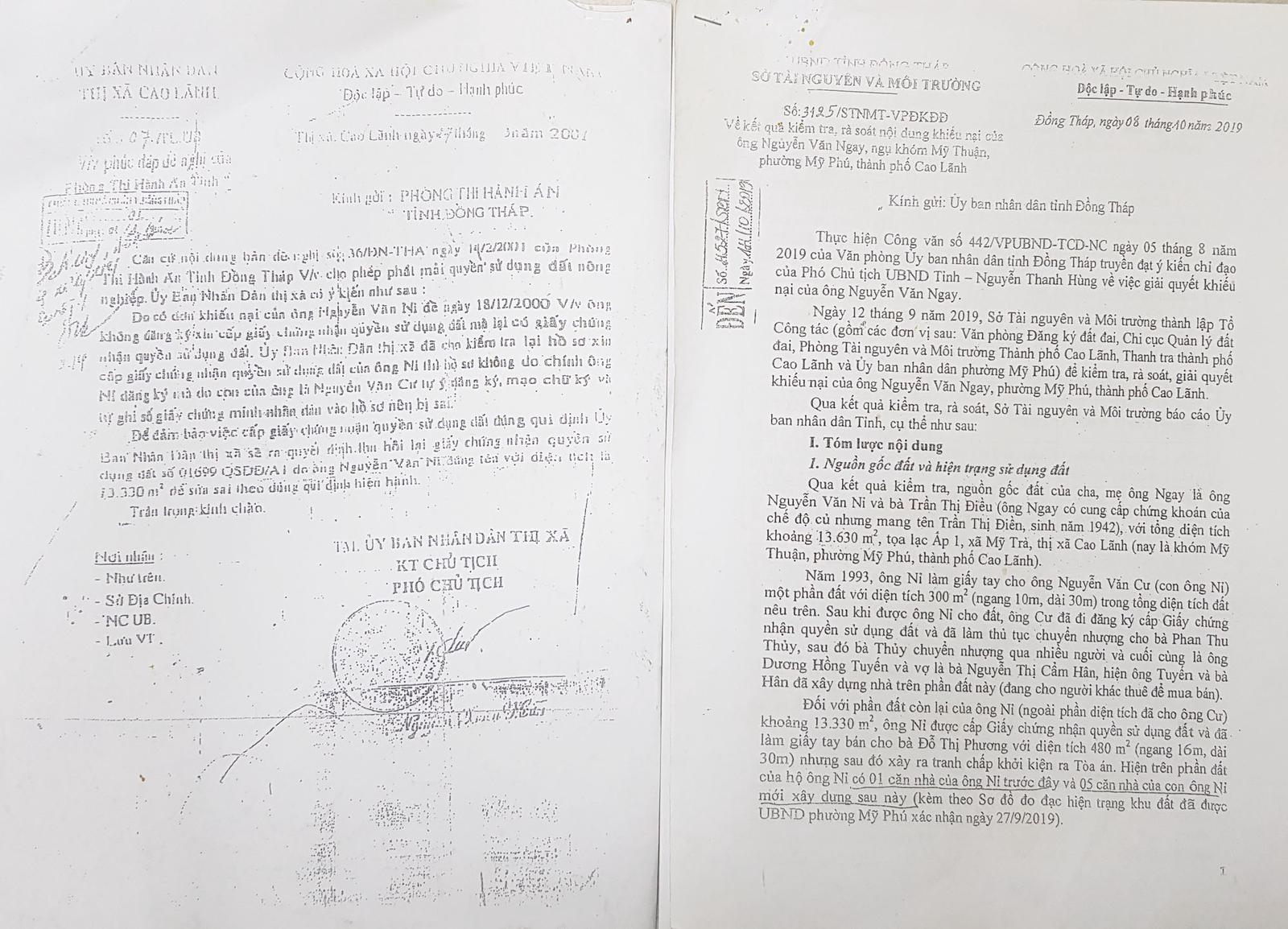 Ngày 27/3/2001, UBND thị xã Cao Lãnh (nay là TP Cao Lãnh) ban hành Văn bản số 07/TL.UB, thừa nhận: “Do có khiếu nại của ông Nguyễn Văn Nỉ đề ngày 18/12/2000 về việc ông không đăng ký xin cấp GCNQSDĐ mà lại có GCNQSDĐ. UBND thị xã đã cho kiểm tra lại hồ sơ xin cấp GCNQSDĐ của ông Nỉ thì hồ sơ không do chính ông Nỉ đăng ký mà do con của ông là Nguyễn Văn Cư tự ý đăng ký, mạo chữ ký và tự ghi số giấy chứng minh nhân dân vào hồ sơ nên bị sai.