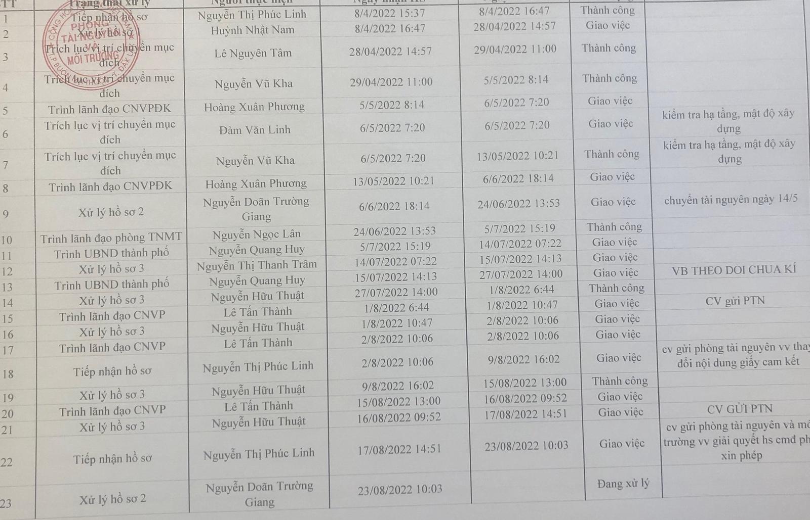 Ông Nguyễn Doãn Trường Giang, chuyên viên của Phòng TN&MT Buôn Ma Thuột đưa ra bảng thống kê quy trình xử lý hồ sơ của bà Nguyệt thể hiện: Ngày nhận hồ sơ (8/4/2022) thành công. Ngày 24/6, trình lãnh đạo Phòng TN&MT thành công. Ngày 13/7, UBND TP mới có quyết định cho chuyển mục đích sử dụng đất và ngày 23/8/2022, hồ sơ của bà Nguyệt vẫn đang trong quy trình xử lý.
