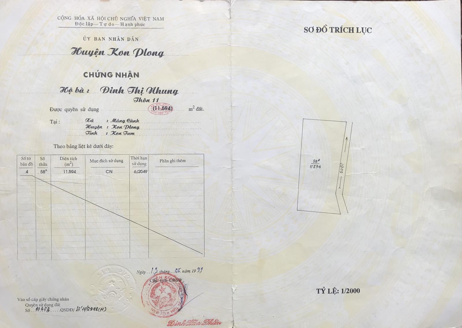 Đến ngày 13/6/1999, bà Nhung được UBND huyện Kon Plong cấp sổ đỏ số P057579, giao cho bà thửa 58A, tờ bản đồ số 4, diện tích hơn 1ha là đất của lâm trường tại xã Măng Cành.