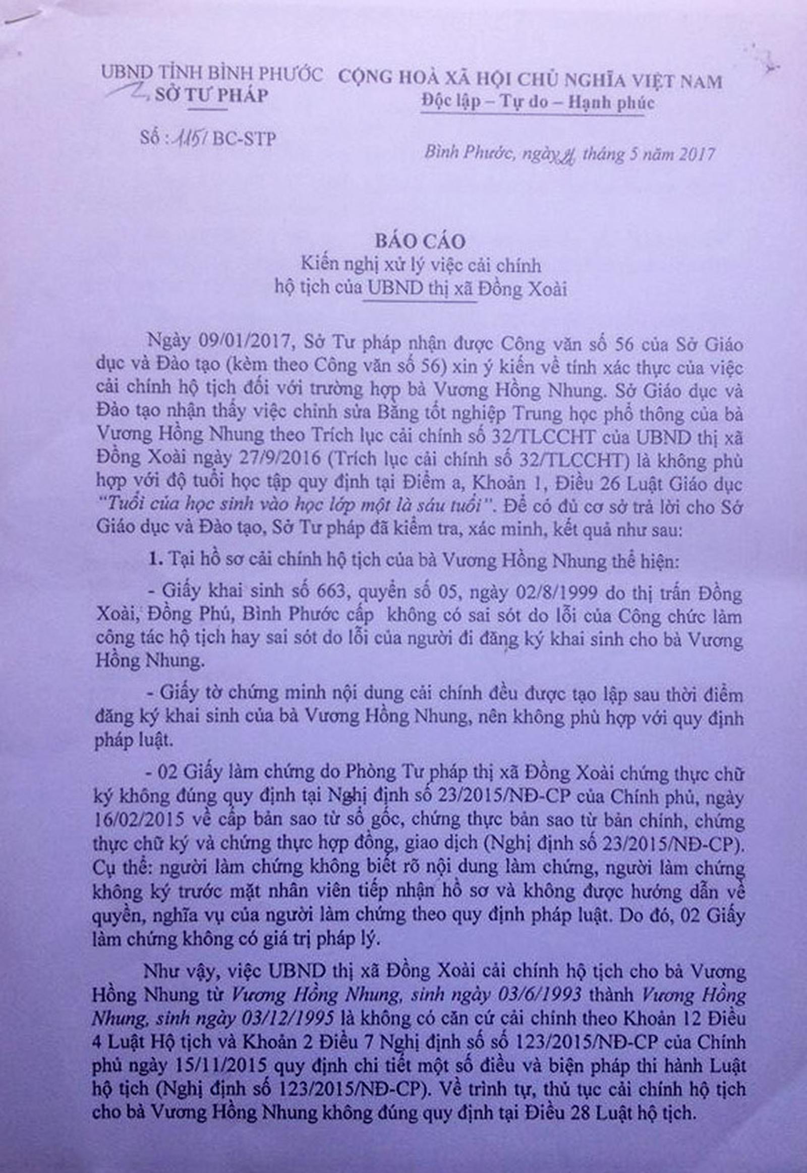 Trong Báo số 115/BC-STP ngày 26/5/2017 gửi UBND tỉnh, ông Bùi Quang Phụng, Giám đốc Sở Tư pháp Bình Phước khẳng định: “Giấy tờ chứng minh nội dung cải chính của bà Nhung không phù hợp với pháp luật. Việc UBND thị xã Đồng Xoài cải chính hộ tịch cho bà Vương Hồng Nhung từ sinh ngày 3/6/1993 thành ngày 3/12/1995 là không có căn cứ cải chính theo Khoản 12, Điều 4 Luật Hộ tịch và Khoản 2, Điều 7 Nghị định số 123/2015/NĐ-CP”.