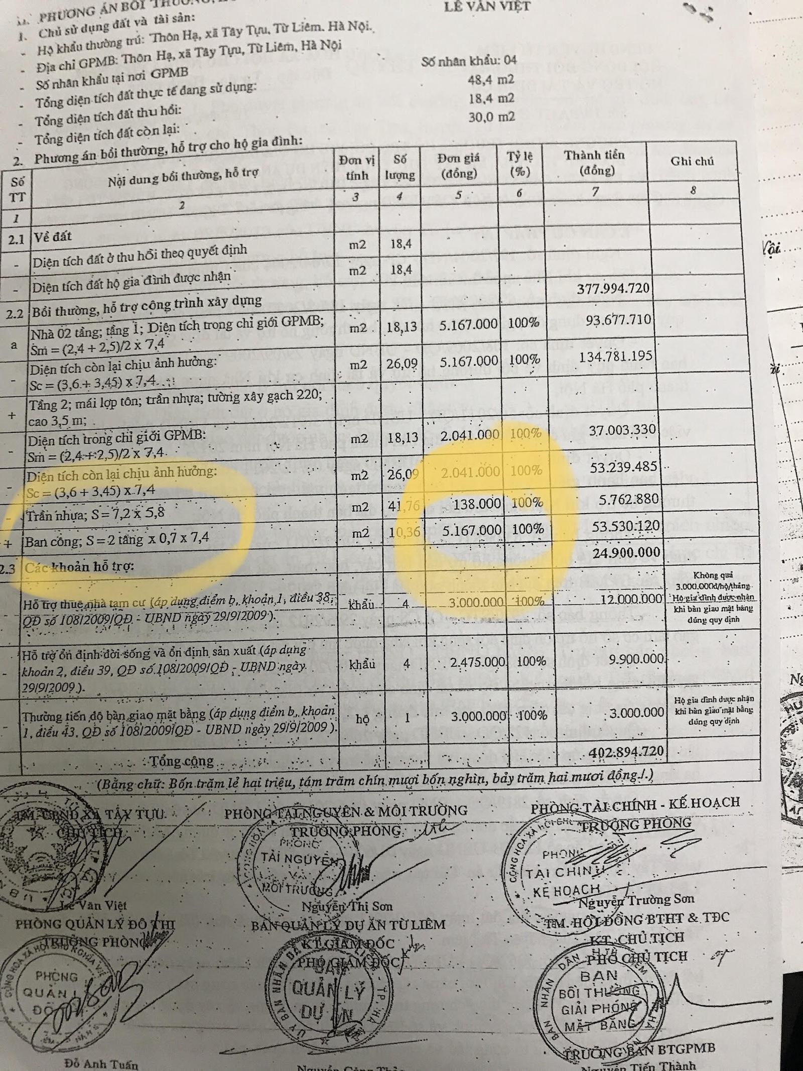 Đặc biệt, cùng 1 dự án có người dân chỉ được bồi thường diện tích lan can là 724.000 đồng/m2 thì Chủ tịch UBND xã Tây Tựu xã được áp đơn giá trên 5,1 triệu đồng/m2, gấp hơn 7 lần.
